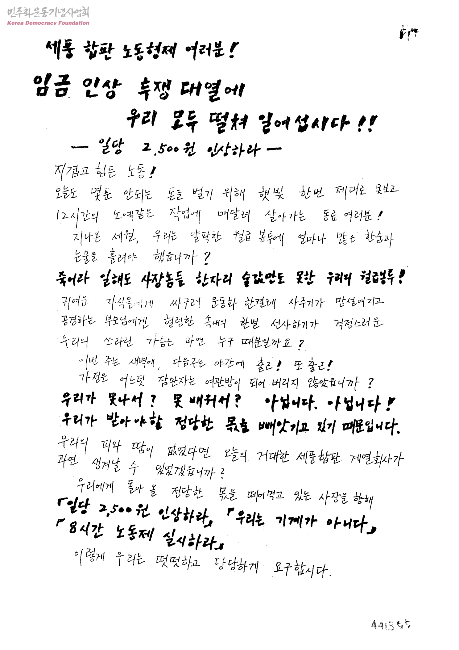 세풍 합판 노동형제 여러분! 임금 인상 투쟁대열에 우리 모두 떨쳐 일어섭시다!! - 일단 2,500원 인상하라