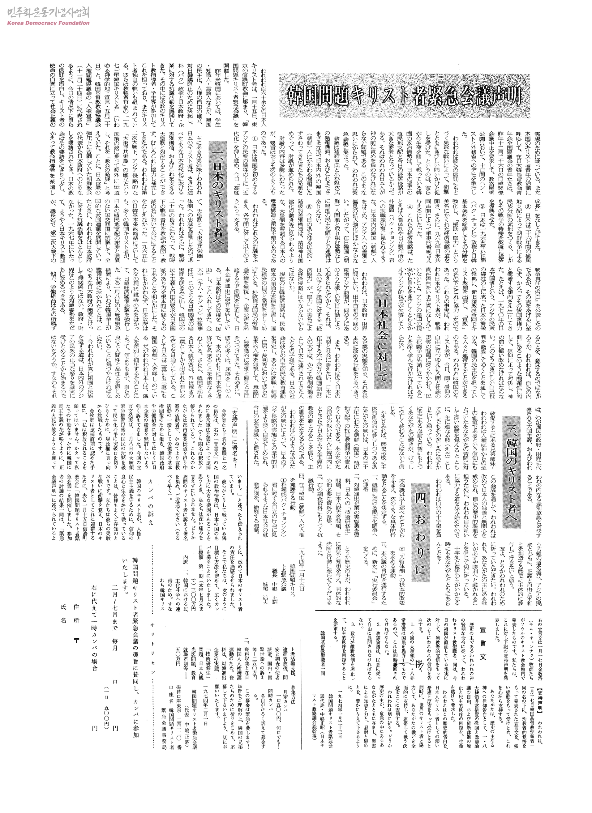- 一. 日本のキリスト者へ 二. 日本社會に對して 三. 韓國のキリスト者へ 四. おわりに