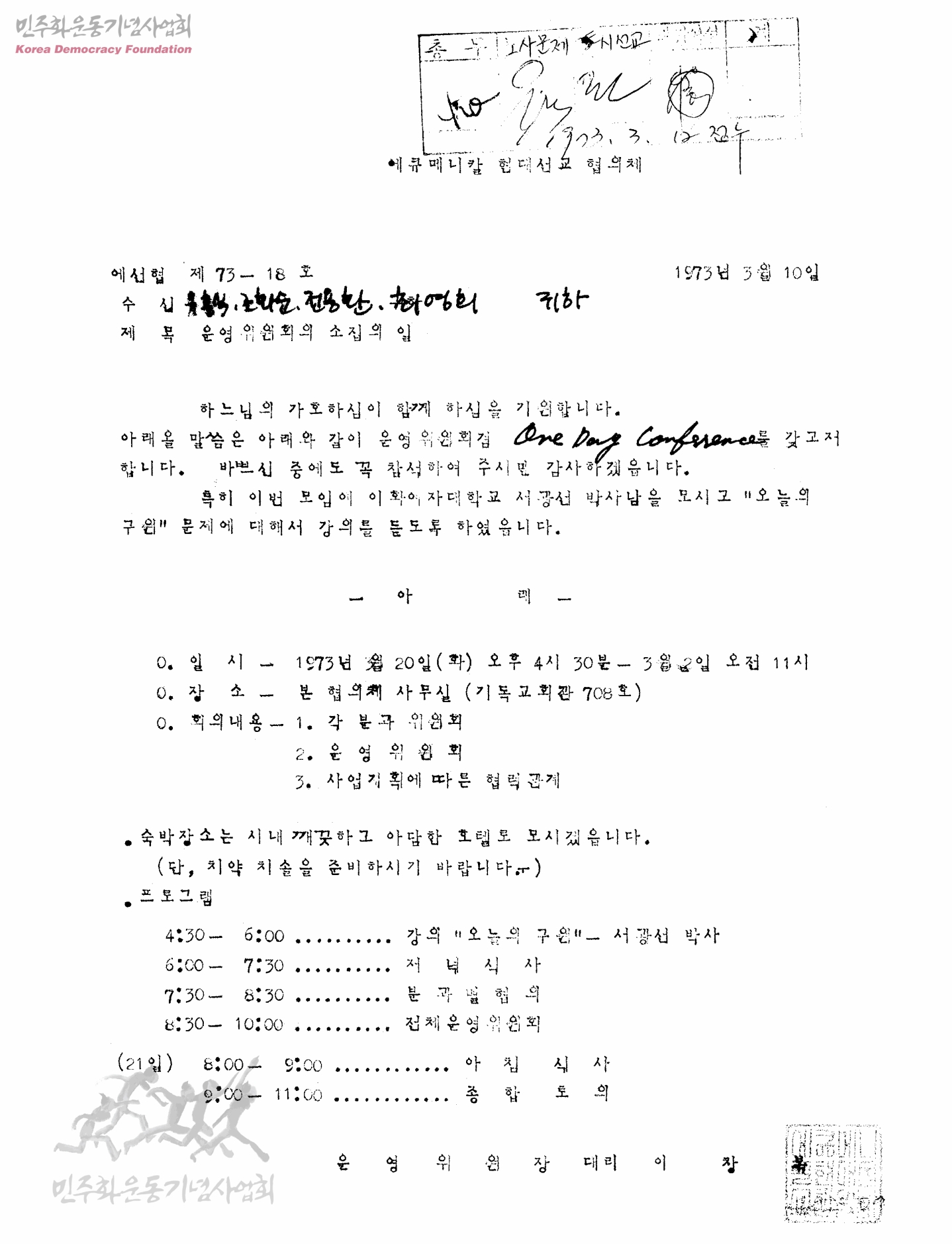 운영위원회 소집의 일 [수신:유흥식, 조화순, 전용환, 최영희]