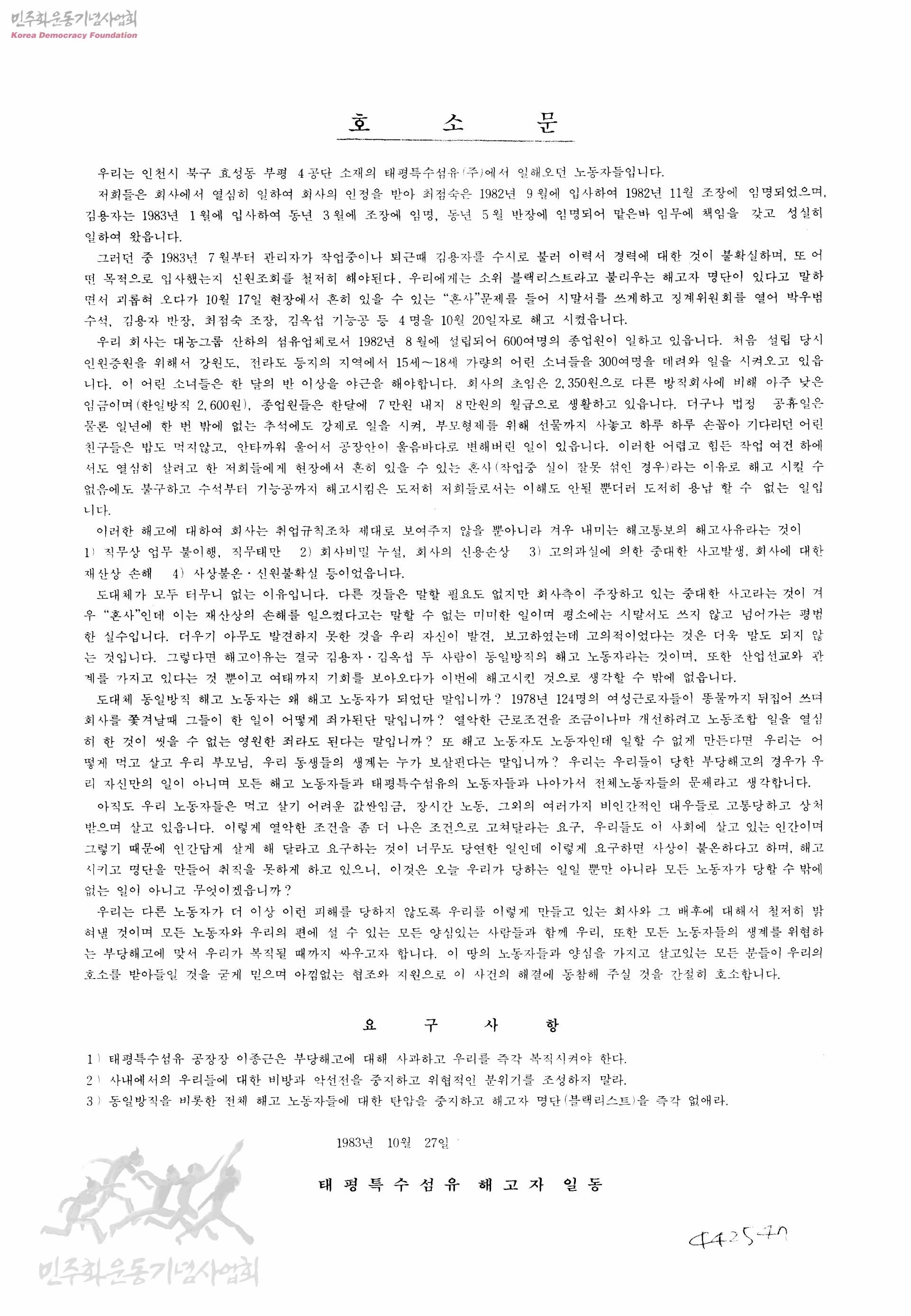 호소문[태평특수섬유 노동자 부당해고 관련]