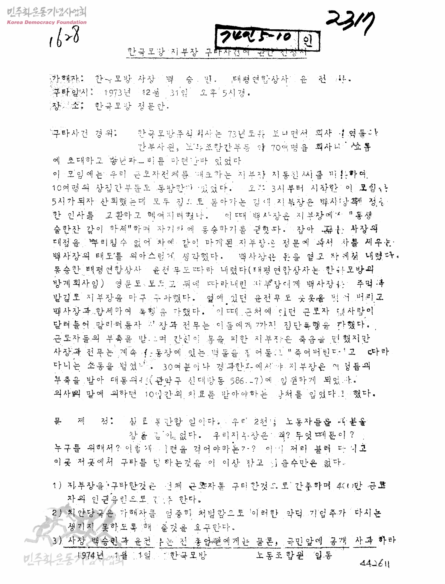 한국모방 지부장 구타사건에 관한 진정서