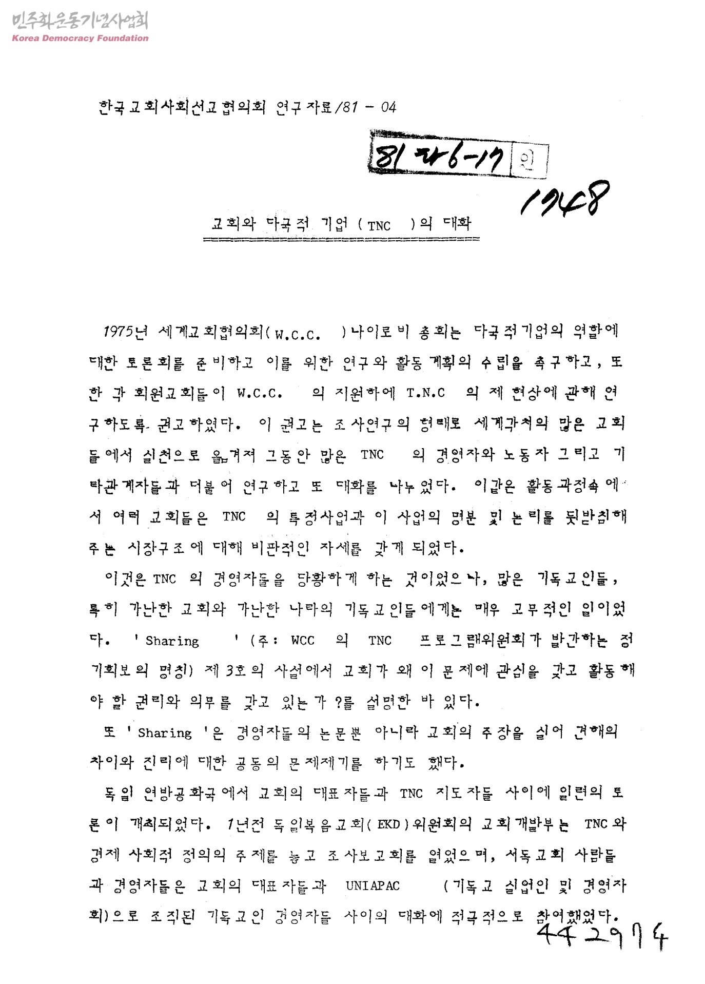 한국교회사회선교협의회 연구자료 / 81-04 교회와 다국적 기업(TNC)의 대화