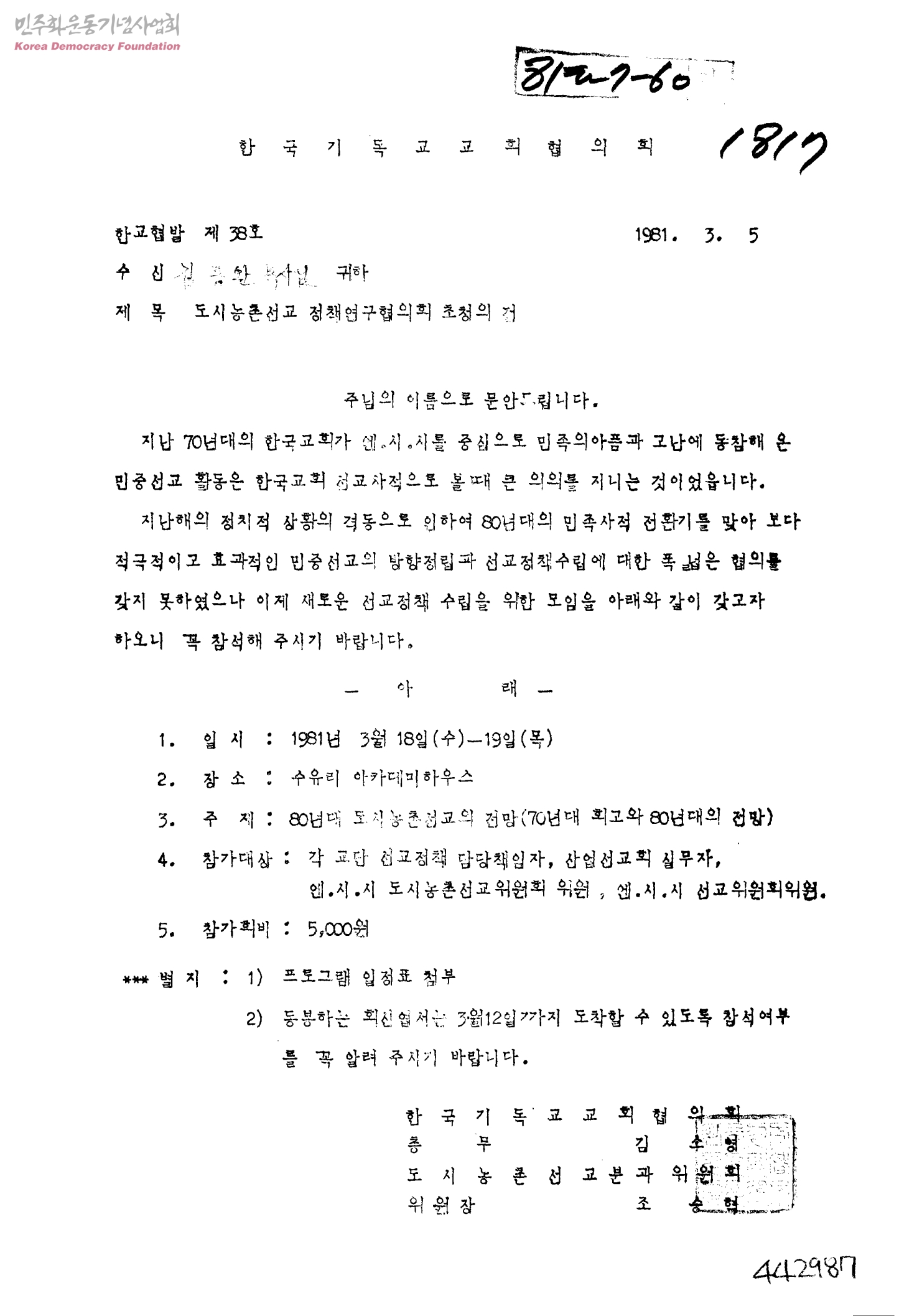 도시농촌선교 정책연구협의회 초청의 건[수신:김동완 목사님]
