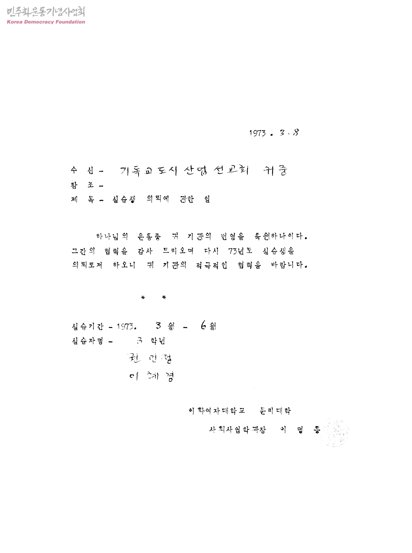 실습생 의뢰에 관한 일[수신:기독교도시산업선교회]