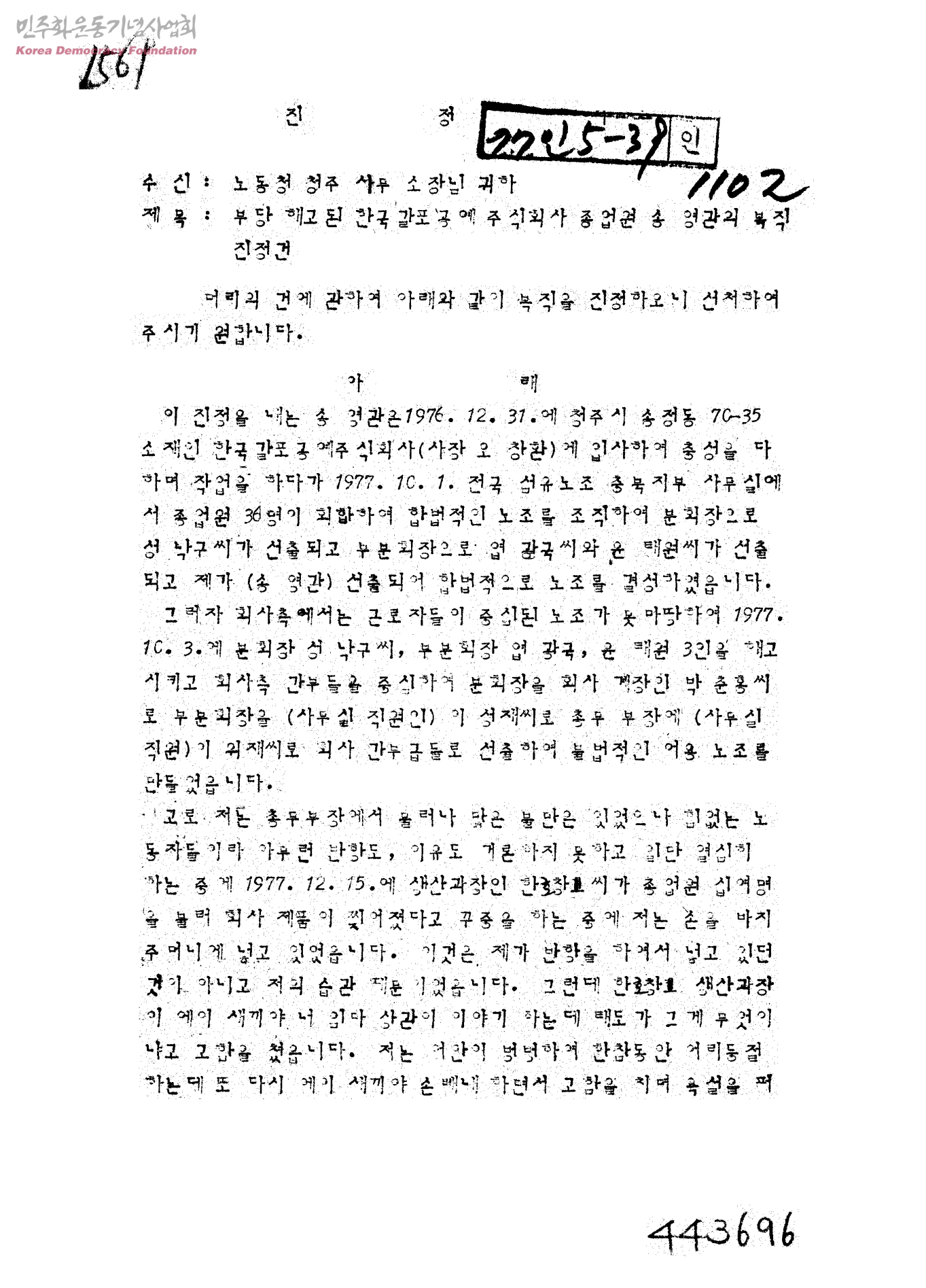 진정서-부당 해고된 한국 갈포 공예 주식회사 종업원 송 영관의 복직 진정건[수신: 노동청 청주 사무 소장님 귀하]
