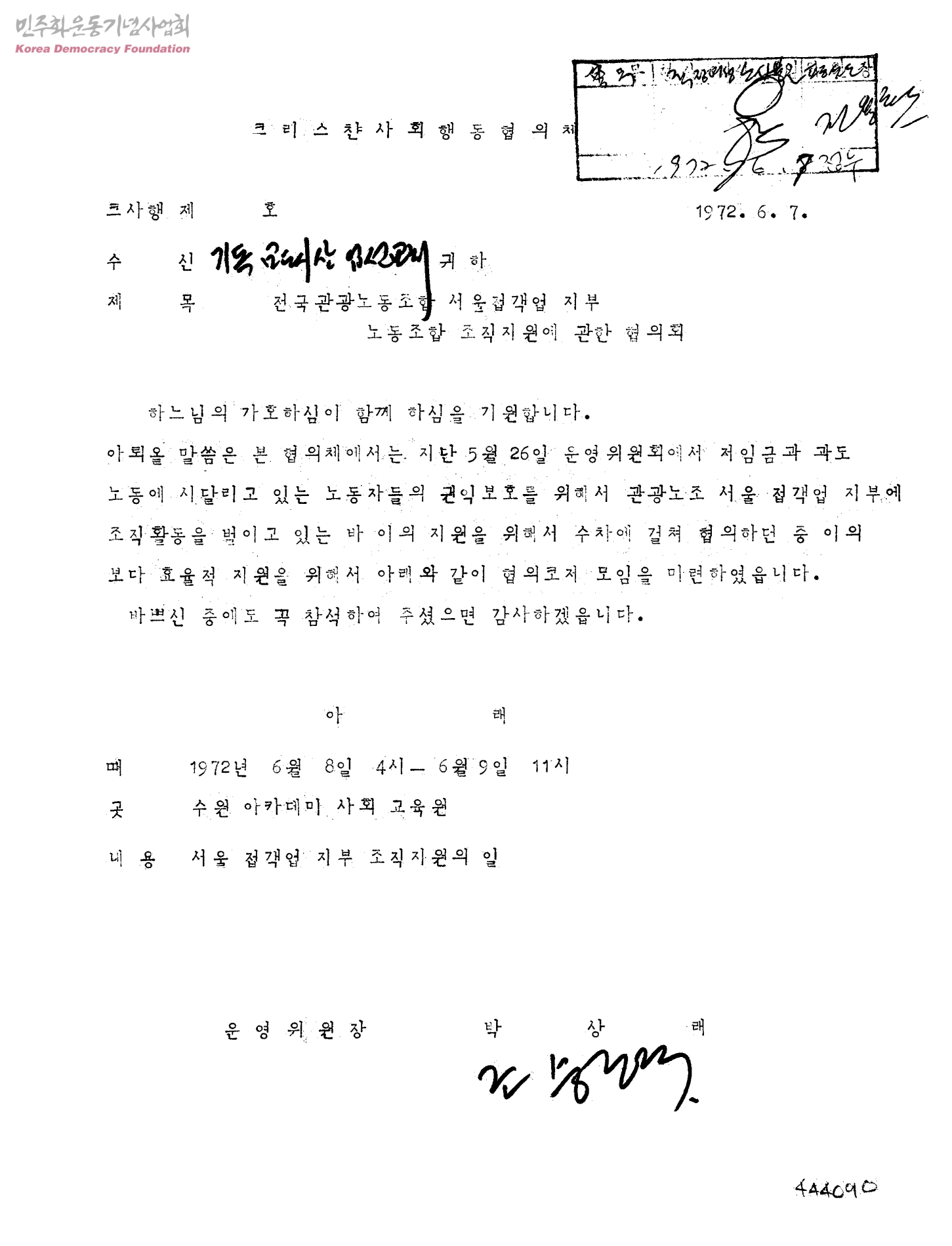 전국관광노동조합 서울접객업 지부 노동조합 조직지원에 관한 협의회[수신:기독교도시산업선교회]