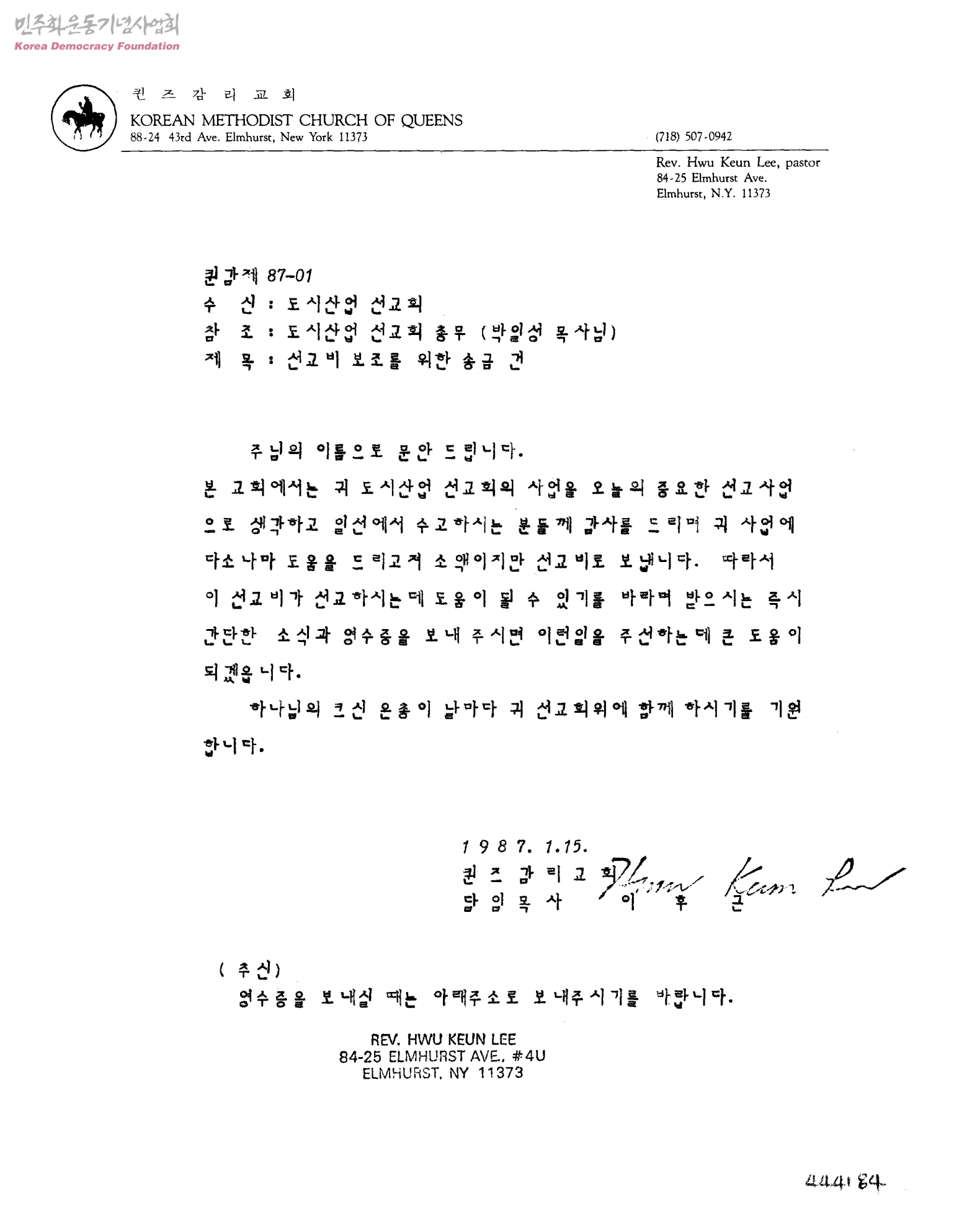 선교비보조를 위한 송금 건[수신:도시산업 선교회,발신:퀸즈감리교회]