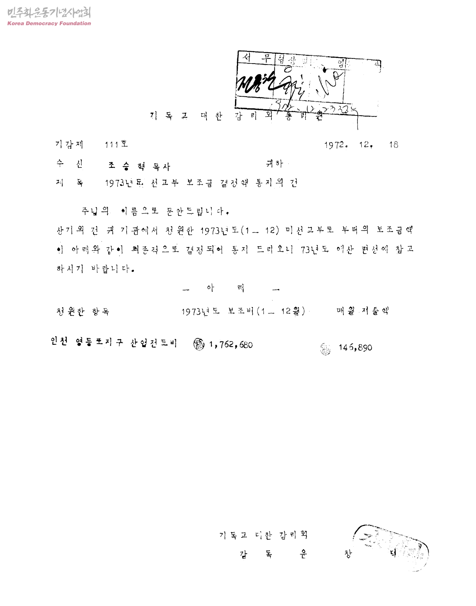 1973년도 선교부 보조금 결정액 통지의 건[수신:조승혁 목사, 발신:기독교 대한 감리회 감독 윤창덕]
