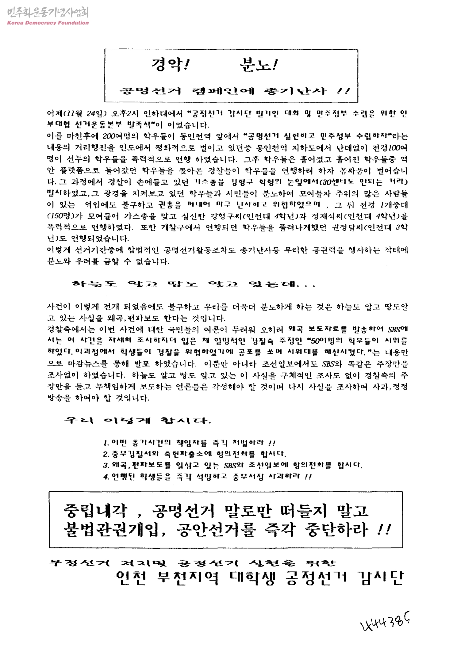 - 공명선거 감시단 발기인 대회 및 민주정부 수립을 위한 인부대협 선거운동본부 발족식 행사도중 경찰의 총기난사관련