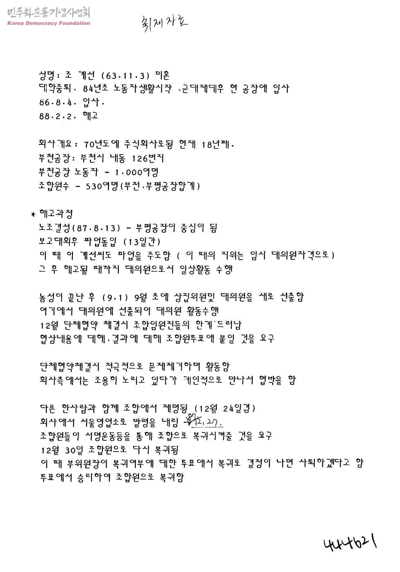 [해고근로자 조계선의 해고과정에 대한 취재자료]