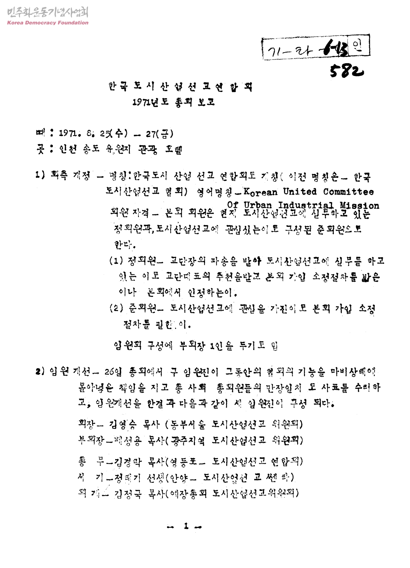 한국 도시산업선교 연합회 1971년도 총회 보고