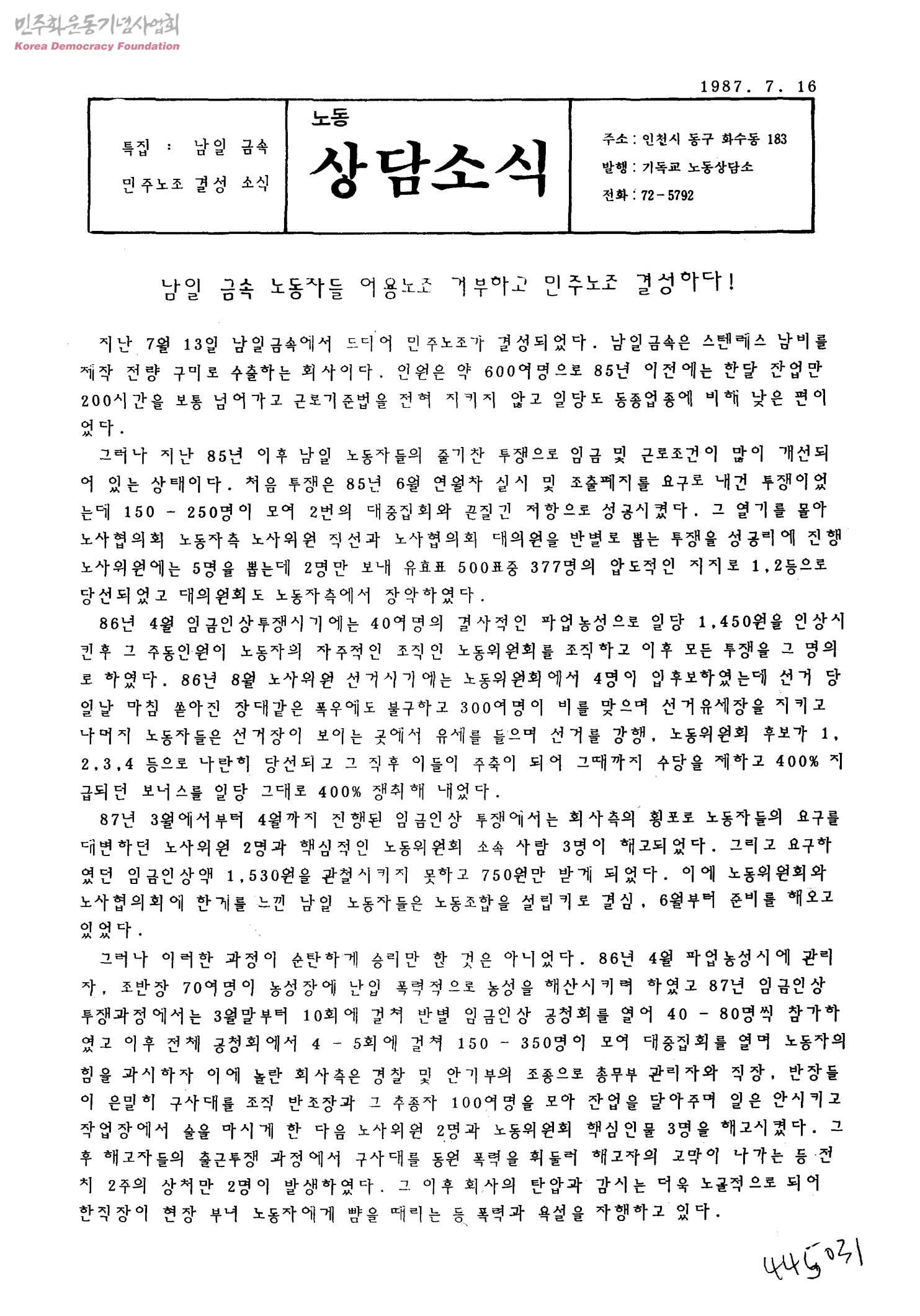 노동 상담소식 특집: 남일 금속 민주노조 결성 소식