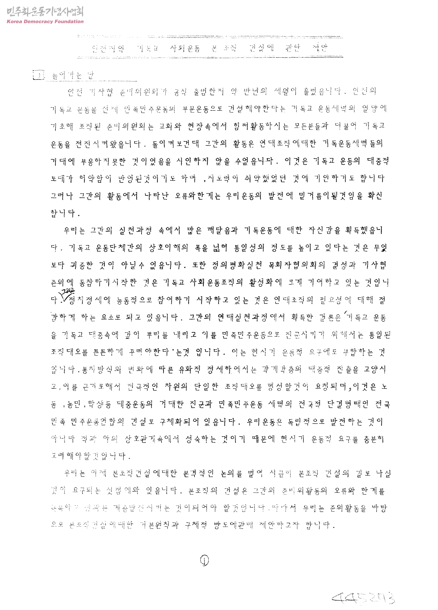 인천지역 기독교 사회운동 본조직 건설에 관한 제안