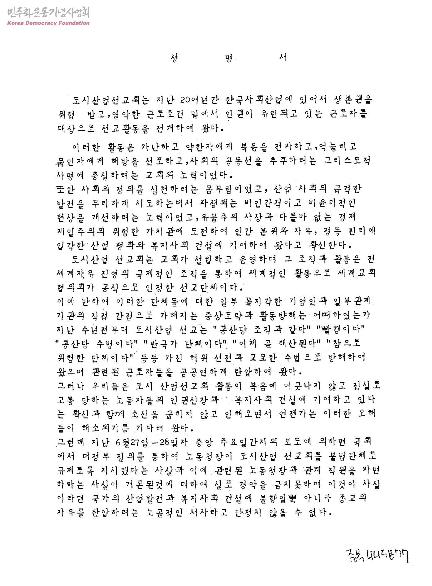 성명서[도시산업선교회 관련]