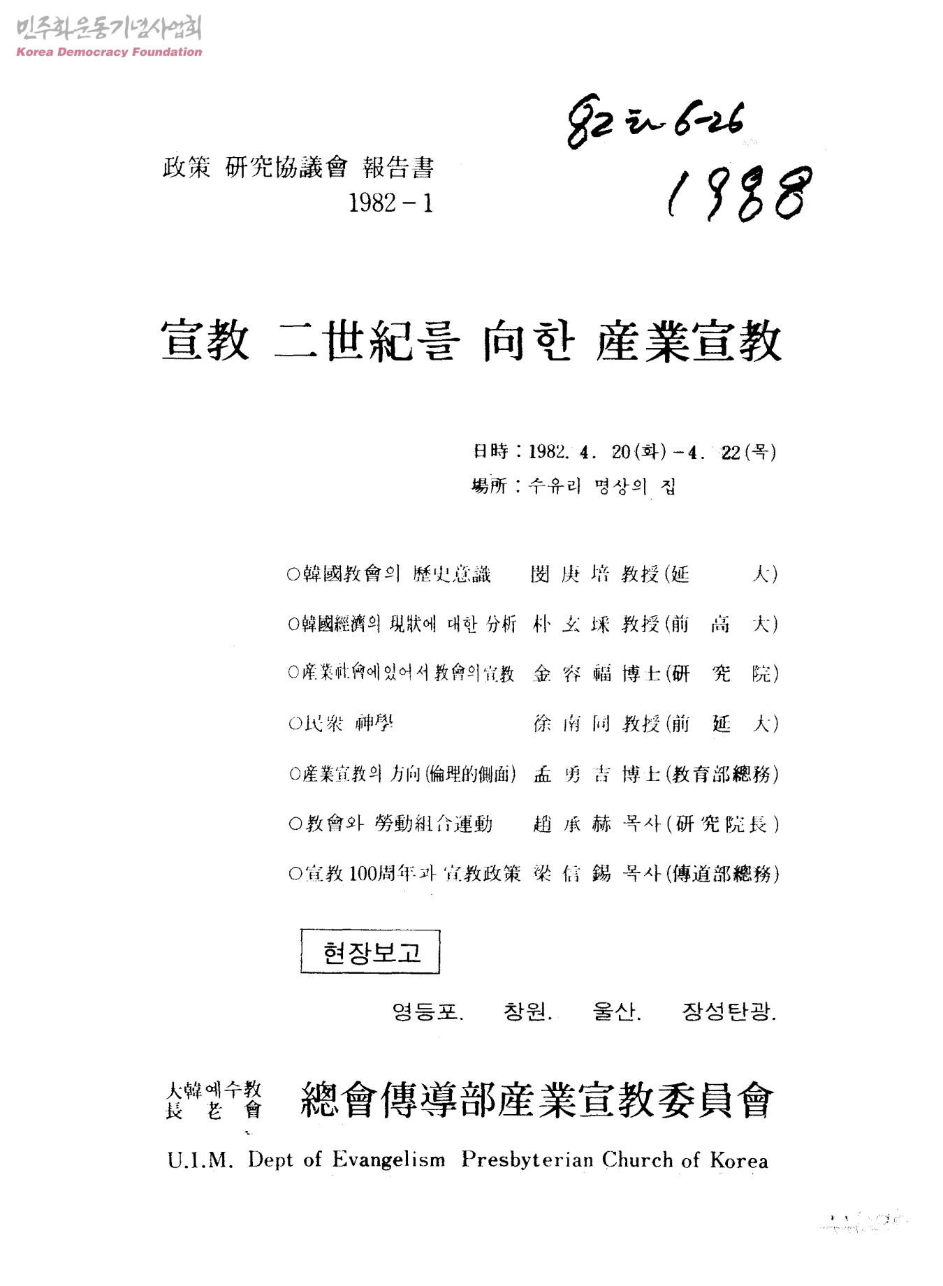 改策 硏究協議會 報告書 1982-1 宣敎 二世紀를 向한 産業宣敎