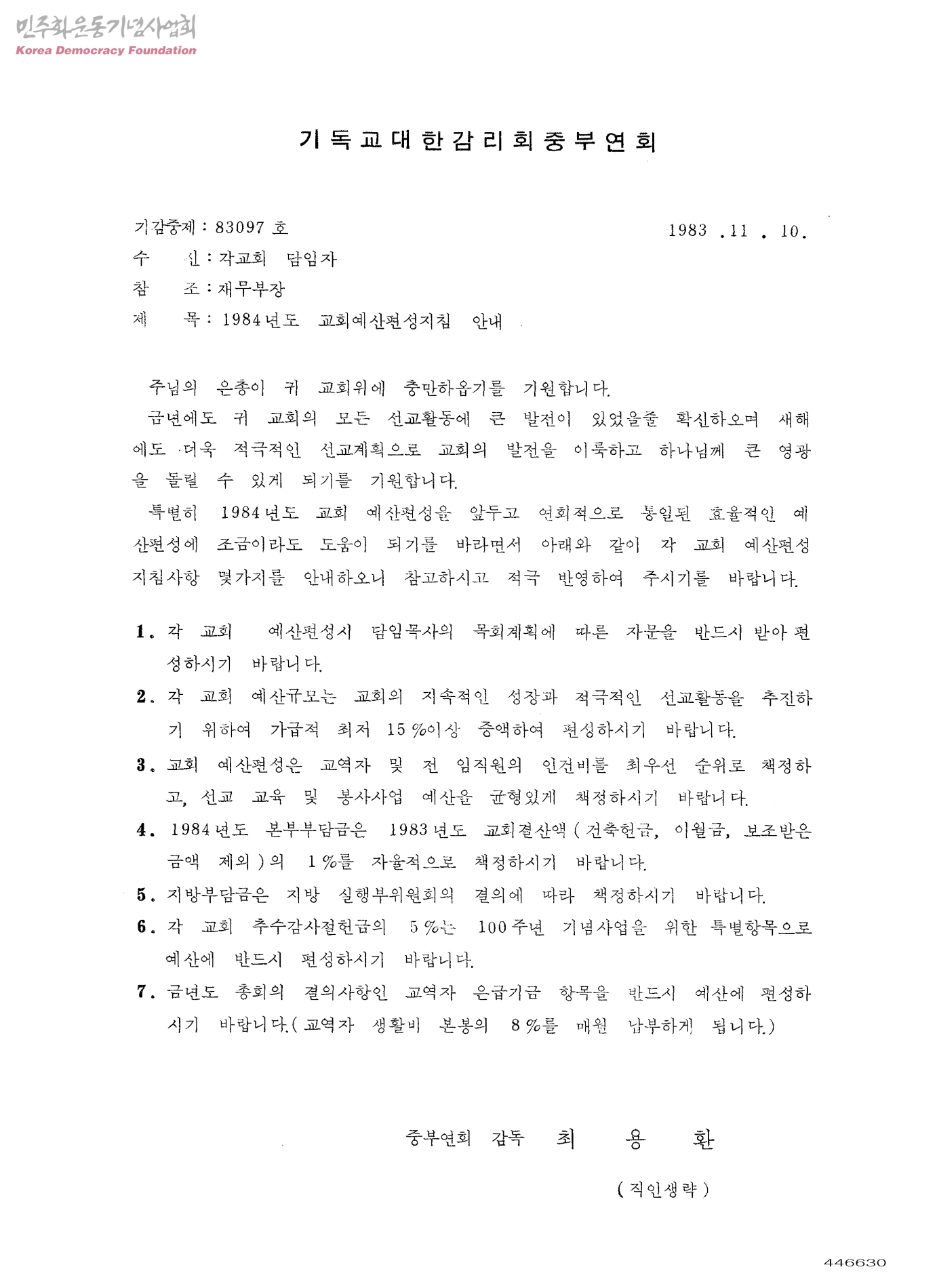 1984년도 교회예산편성지침 안내[수신:각교회 담임자]