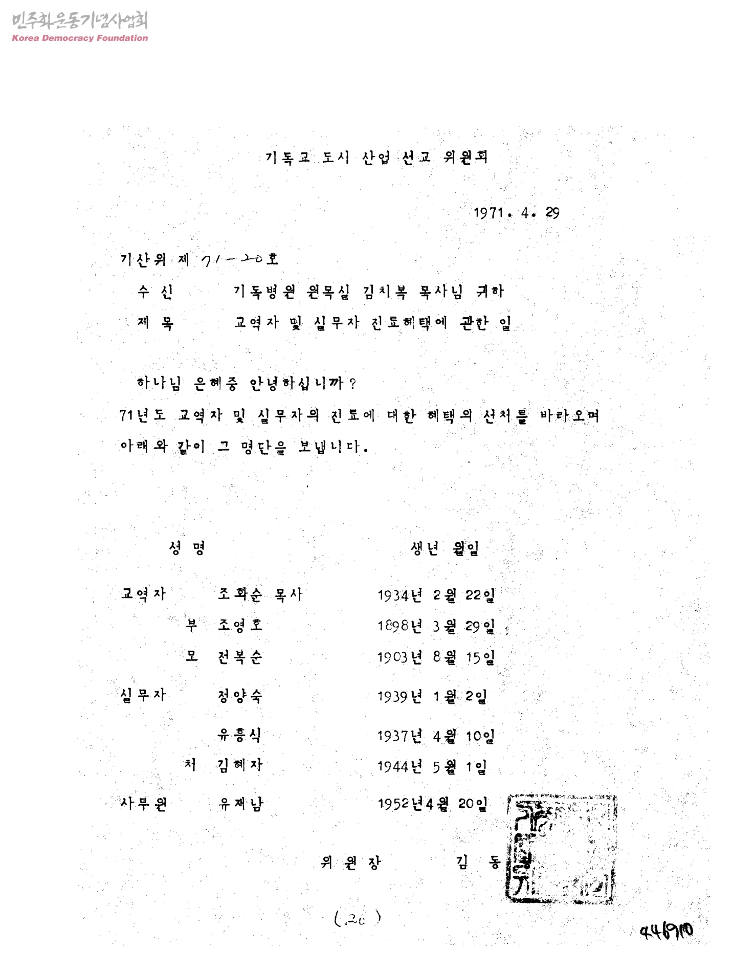 교역자 및 실무자 진료혜택에 관한 일[수신:기독병원 원목실 김치복 목사님]