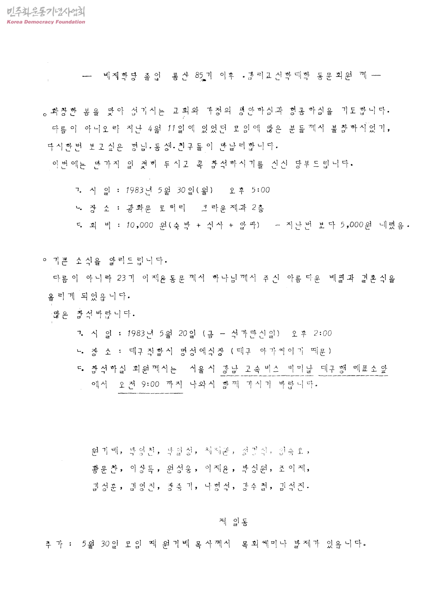 배제학당 졸업 통산 85기 이후 감리교신학대삭 동문회원 께-[4월11일 정기모임과 5월20일 이재윤 동문의 자녀 결혼식]
