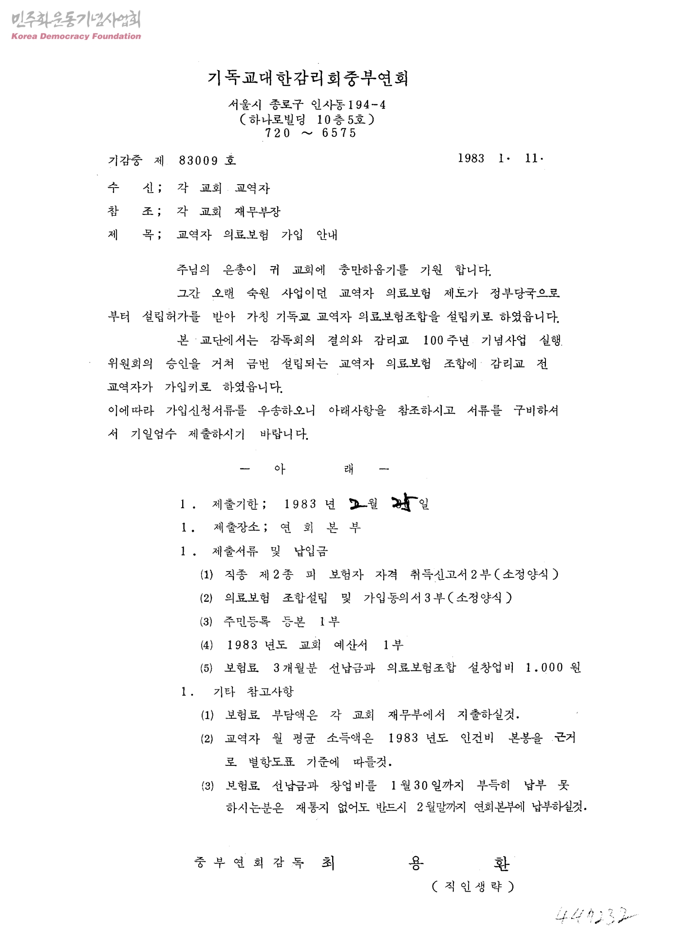 교역자 의료보험 가입 안내[수신:각 교회 교역자, 발신:기독교대한감리회 중부연회]