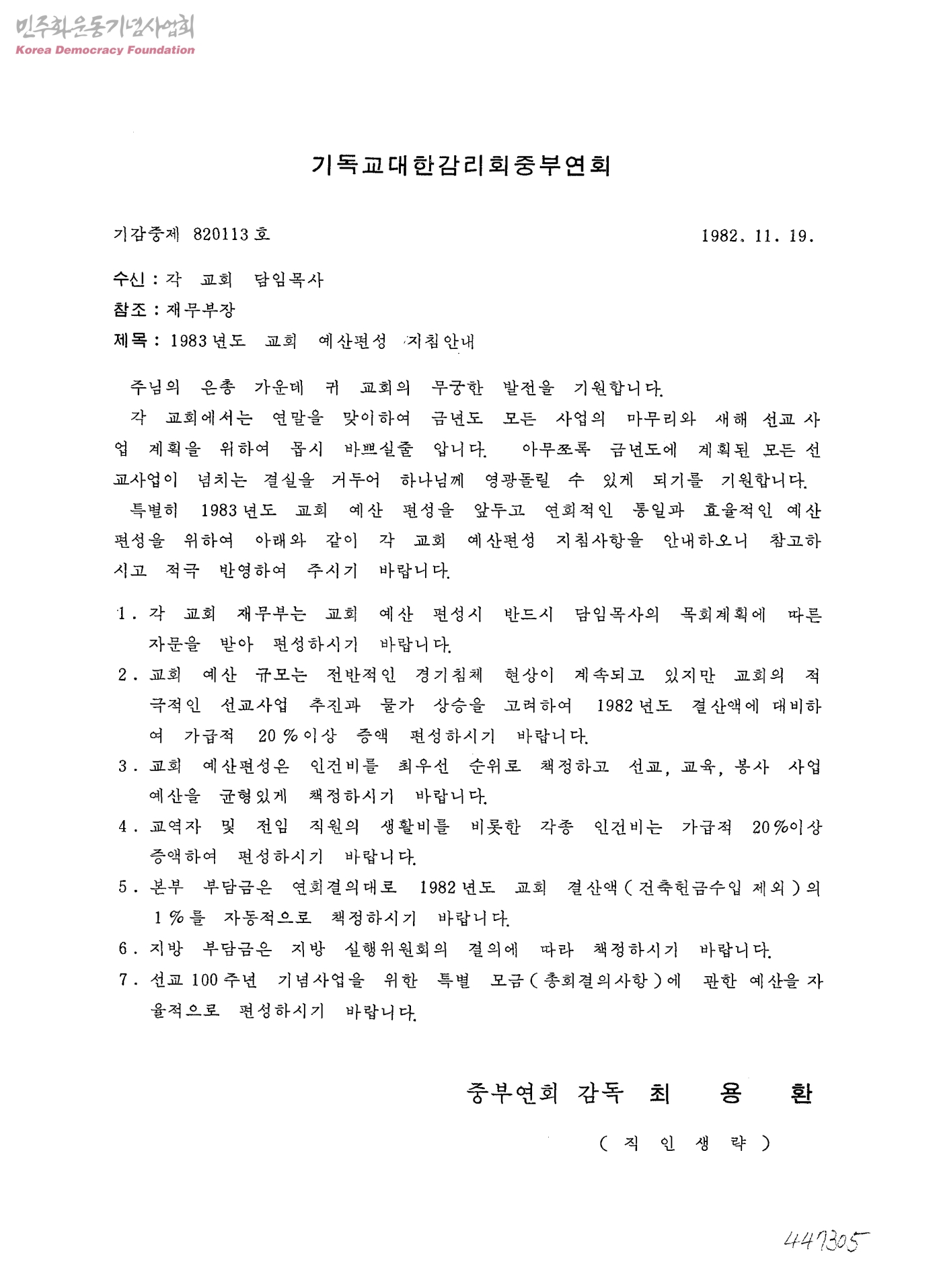 1983년도 교회 예산편성 지침안내[수신:각 교회 담임목사, 발신:기독교대한감리회 중부연회]