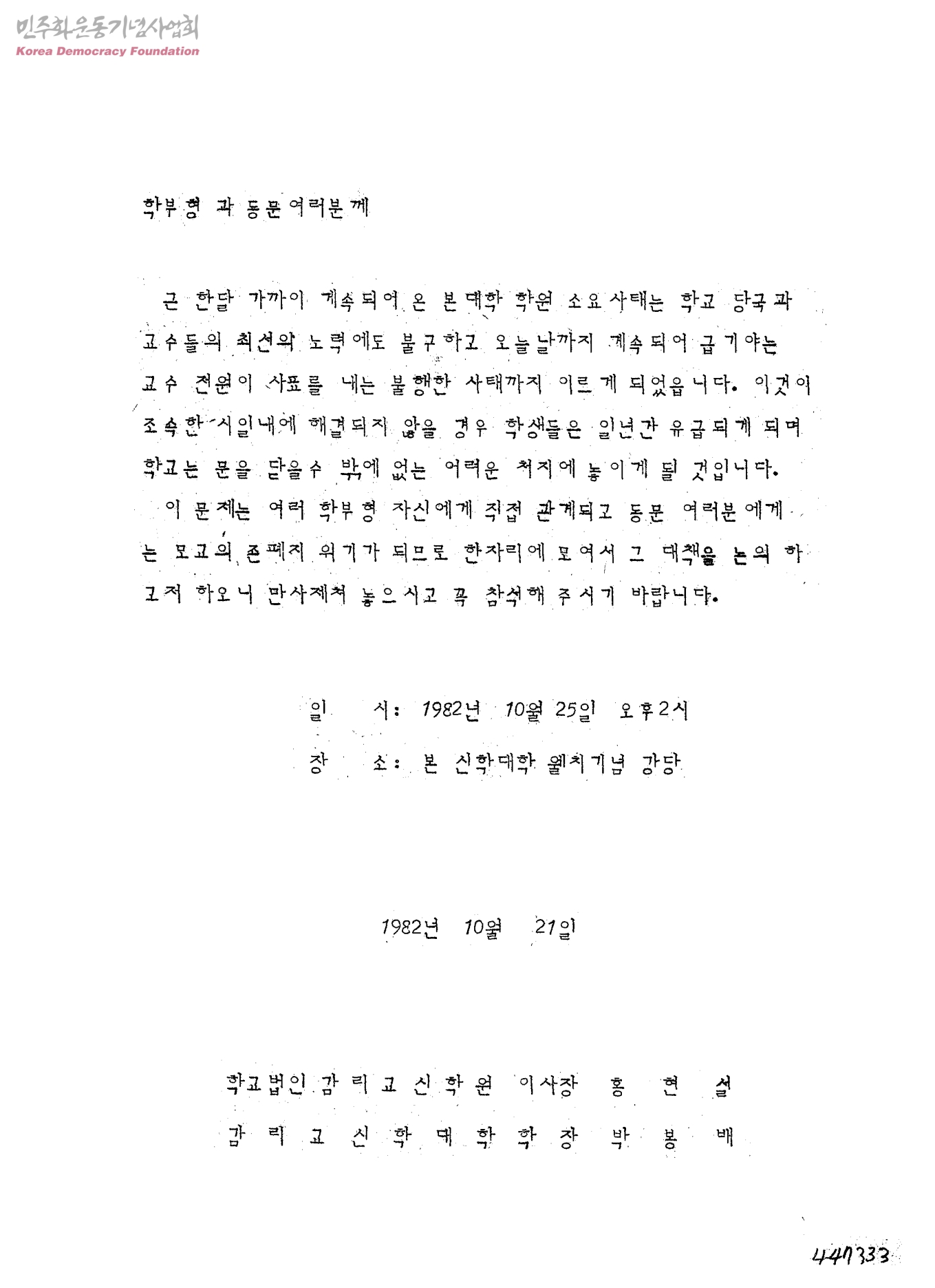 [학교법인감리교신학원,감리교신학대학이 학부형과 동문들에게 보내는 감리신학대학 사태에 대한 대책 논의 참석에 관한 수.발신문서]