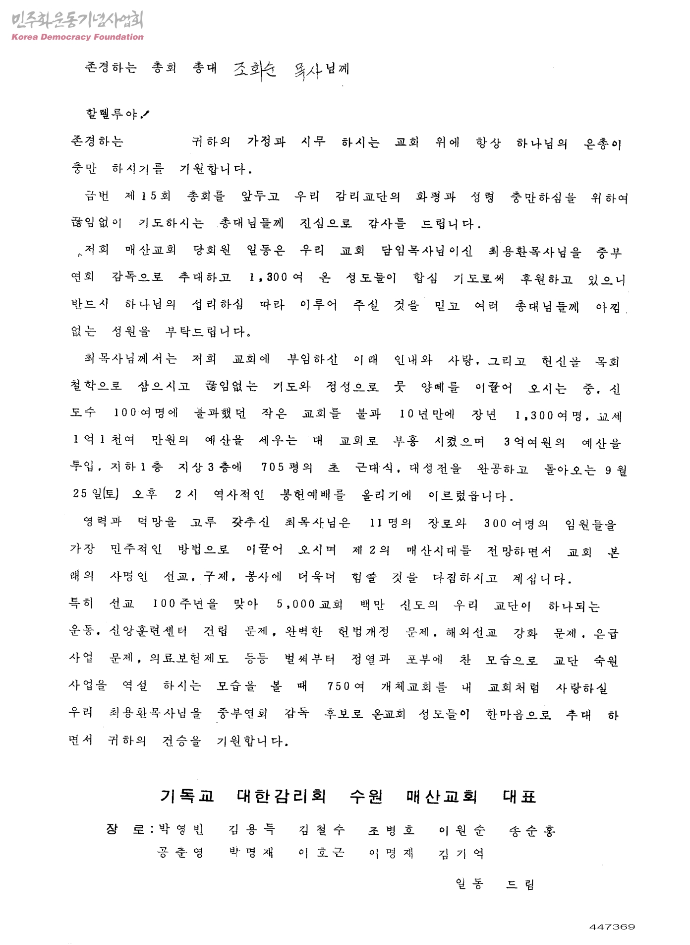 [기독교대한감리회 수원매산교회가 조화순 목사에게 보내는 감시의 편지]