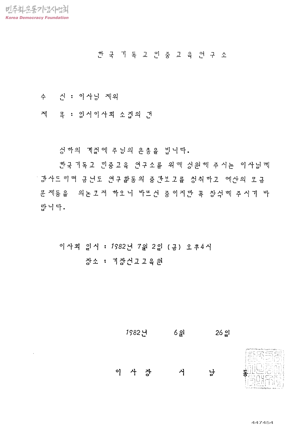 임시이사회 소집의 건[수신:이사, 발신:한국기독교민중교육연구소]