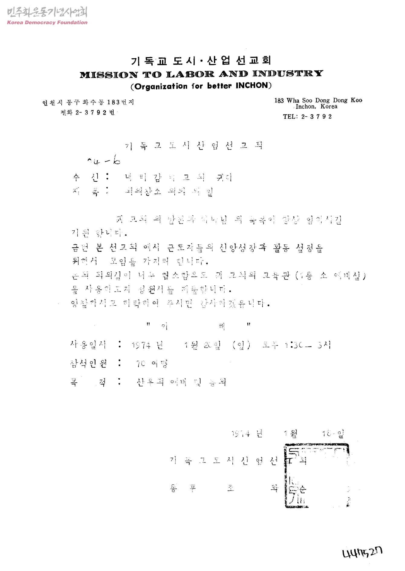 회의장소 의뢰의 일[수신:내리감리교회]