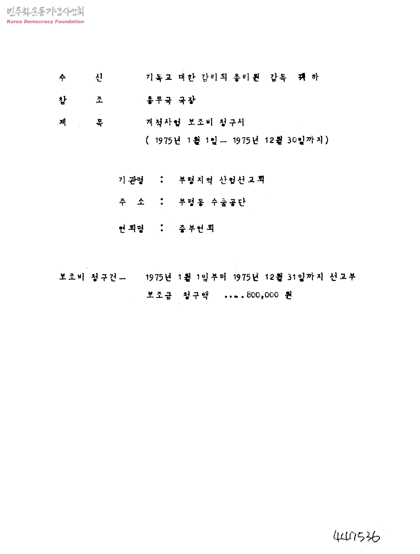 개척사업 보조비 청구서[수신:기독교 대한 감리회 총리원 감독]