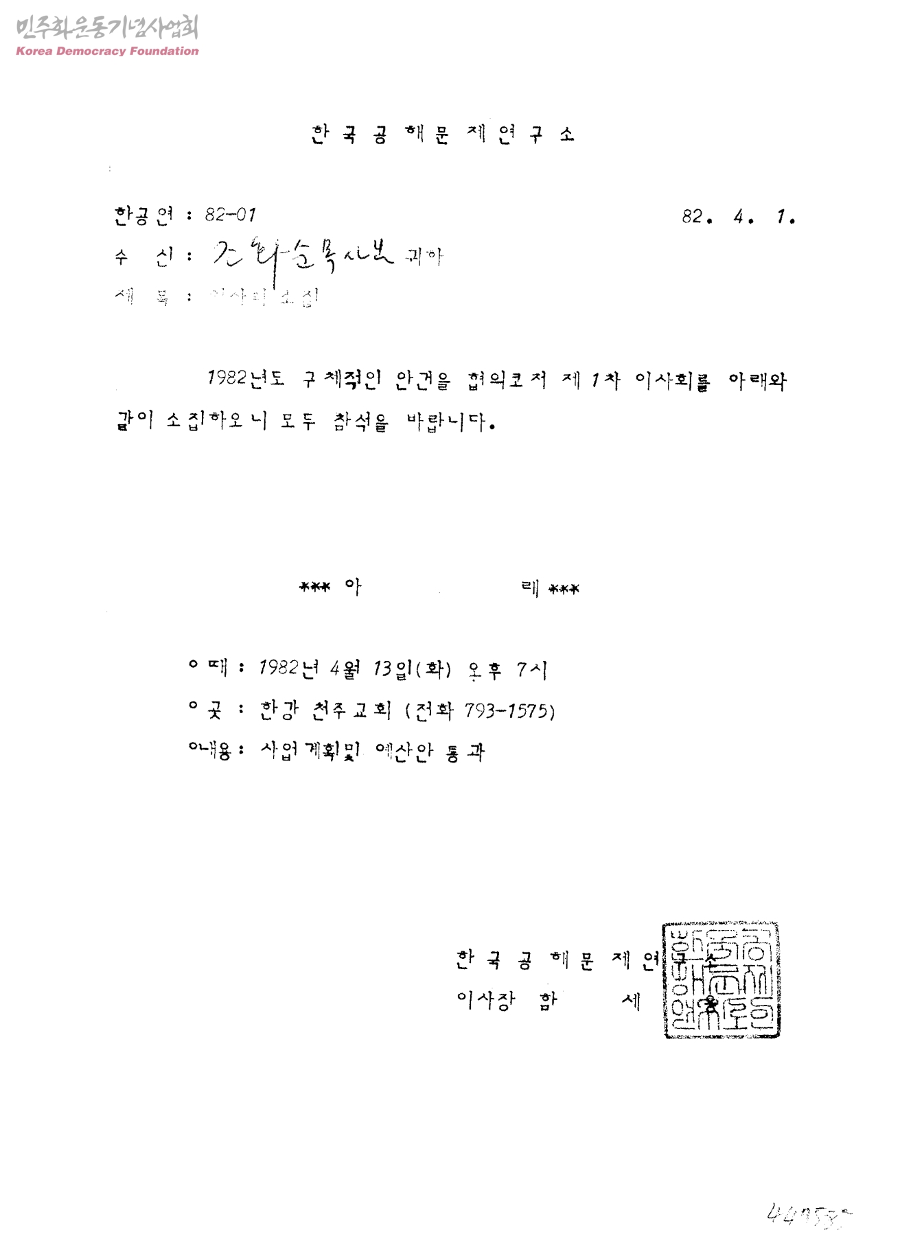 이사회소집[수신:조화순 목사, 발신:한국공해문제연구소]