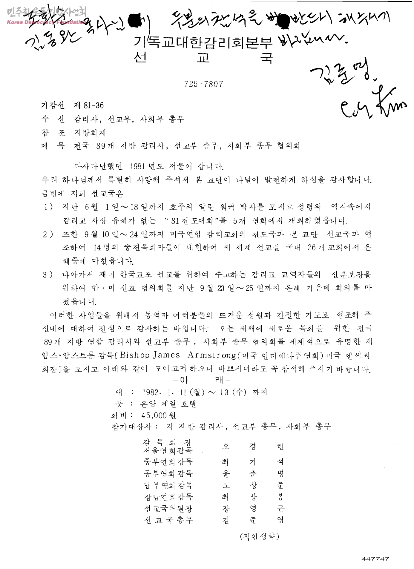 전국 89개 지방 감리사, 선교부 총무, 사회부 총무 협의회[수신:감리사,선교부,사회부 총무, 발신:기독교대한감리회본부 선교국]