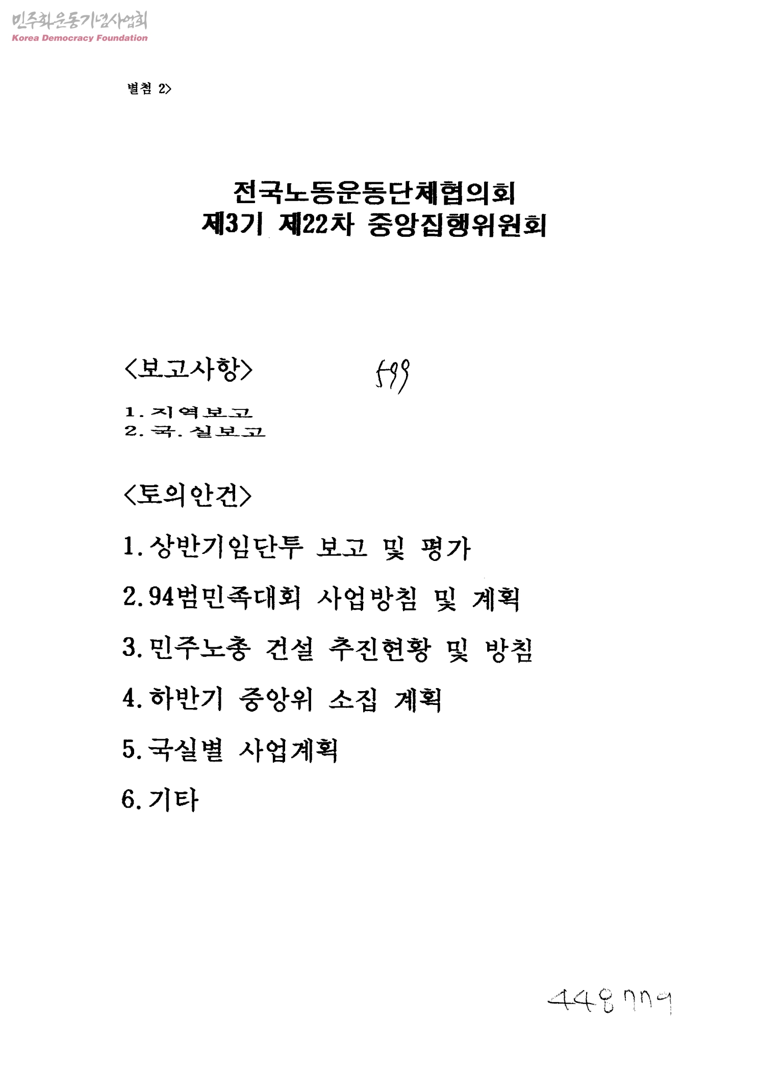 - 1. 상반기임단투 보고 및 평가 2. 94범민족대회 사업방침 및 계획 3. 민주노총 건설 추진현황 및 방침 4. 하반기 중앙위 소집 계획 5. 국실별 사업계획 6. 기타
