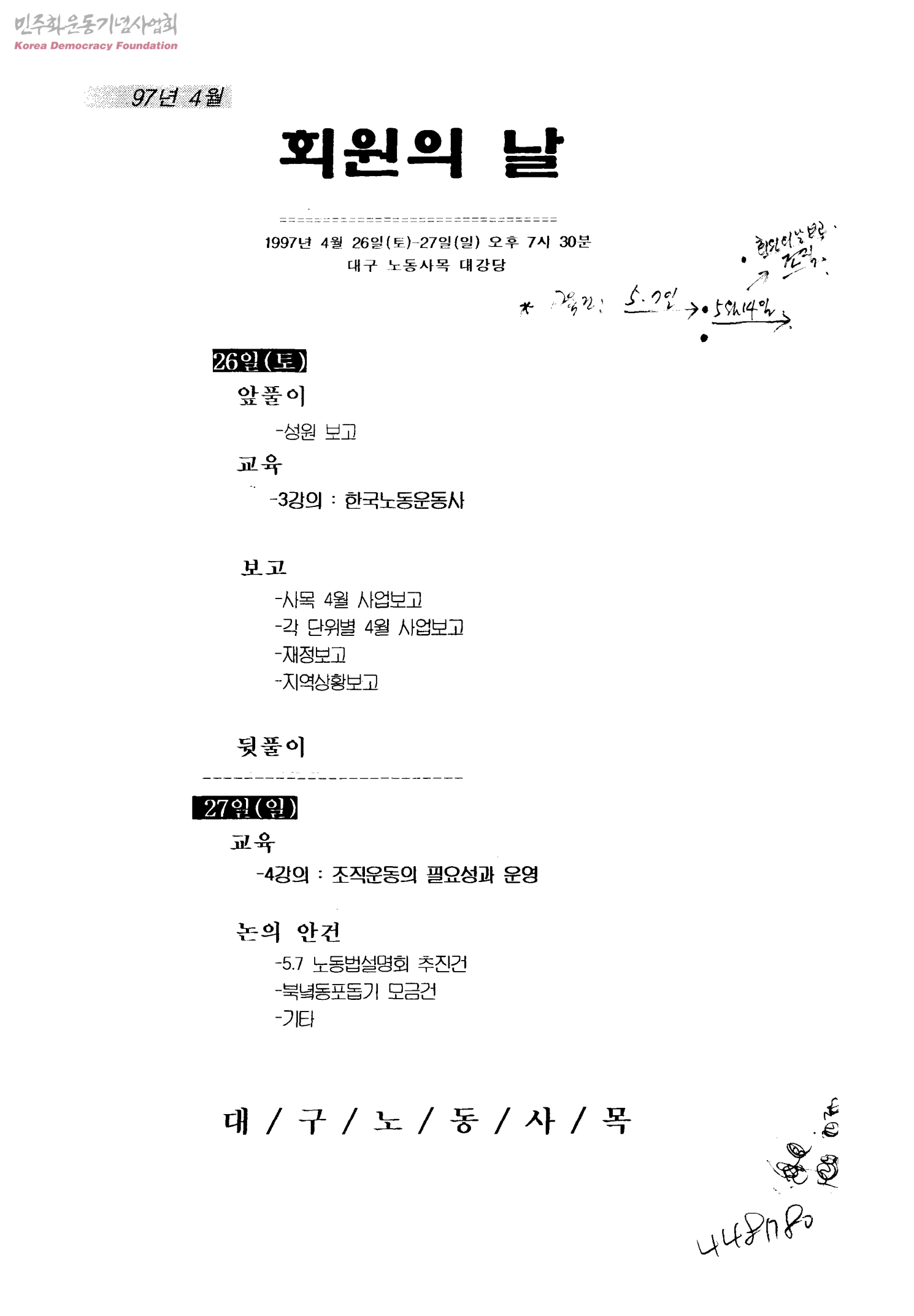 - 5/7 노동법 설명회 준비건,북녘동포돕기 모금건,5.1절 정신계승 대구경북 민중대회 참가건,한국노동운동사