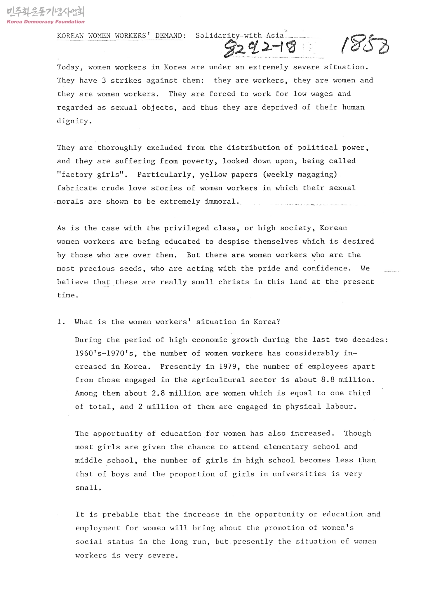 KOREAN WOMEN WORKERS' DEMAND: Solidarity with Asia