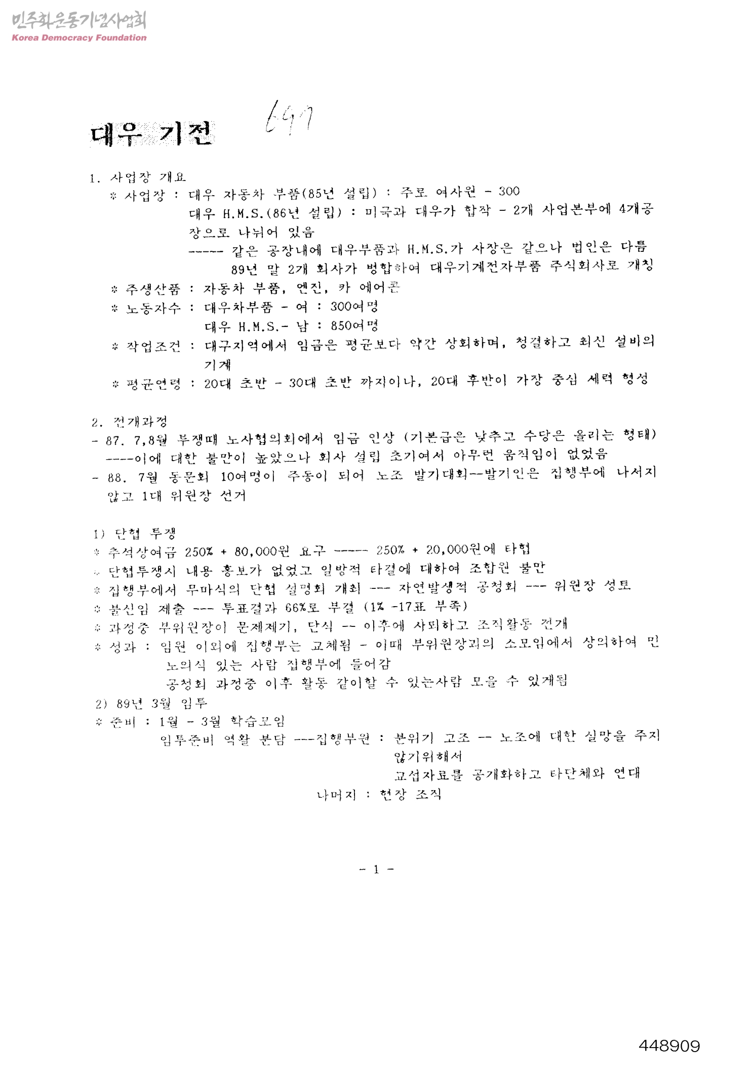 [대우 기전과 후레아 패션의 근무환경 및 노조운동 과정과 그 특징]