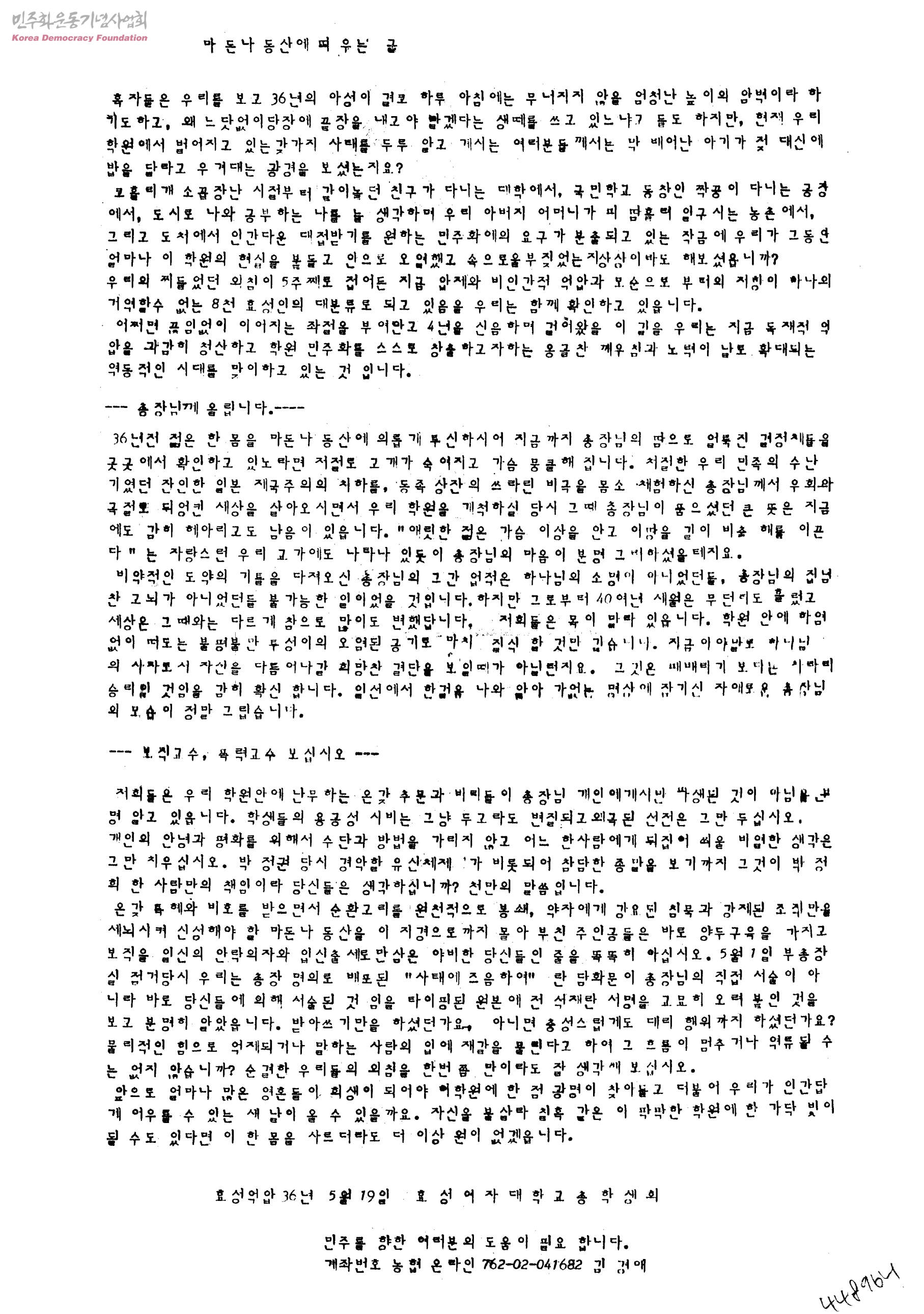 - 생산자 및 기증자가 ‘박용수’인 사진의 사용은 구매신청을 클릭하여 직접 사진 구매 신청을 하실 수 있습니다. 생산자 및 기증자가 ‘경향신문사’인 사진의 사용은 경향신문사 담당자(02-3701-1635)를 통해 구매하실 수 있습니다. 그 외의 생산자 및 기증자는 민주화운동기념사업회 사료관 담당자( hyunchaek@kdemo.or.kr / 02-6440-8961 )에 문의바랍니다.
