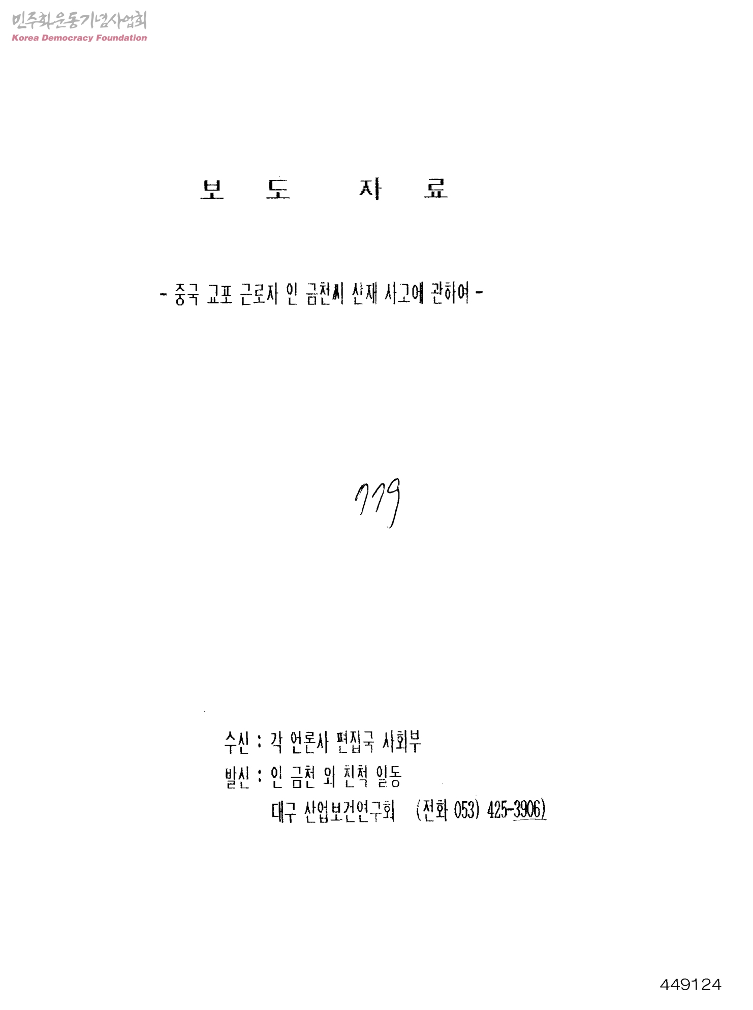 보도자료-중국 교포 근로자 인 금천씨 산재 사고에 관하여[수신:각언론사 편집국 사회부, 발신:인 금천 외 친척 일동,대구산업보건연구회]