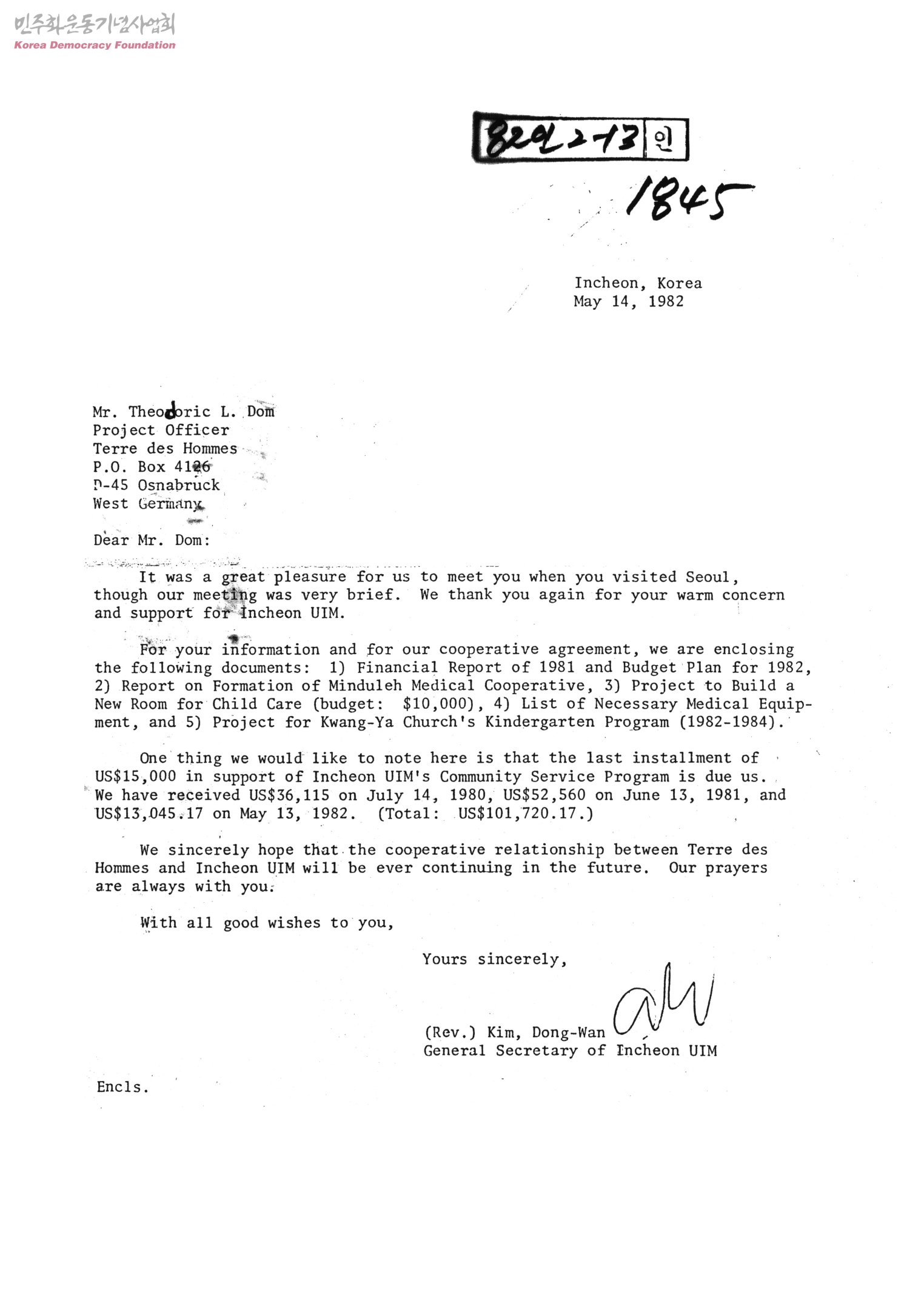 [자금신청을 위한 제반서류 송부에 관한 편지 발신: 김동완, 수신:Terre des Hommes의 Project Officer Mr.Theodoric L. Dom]