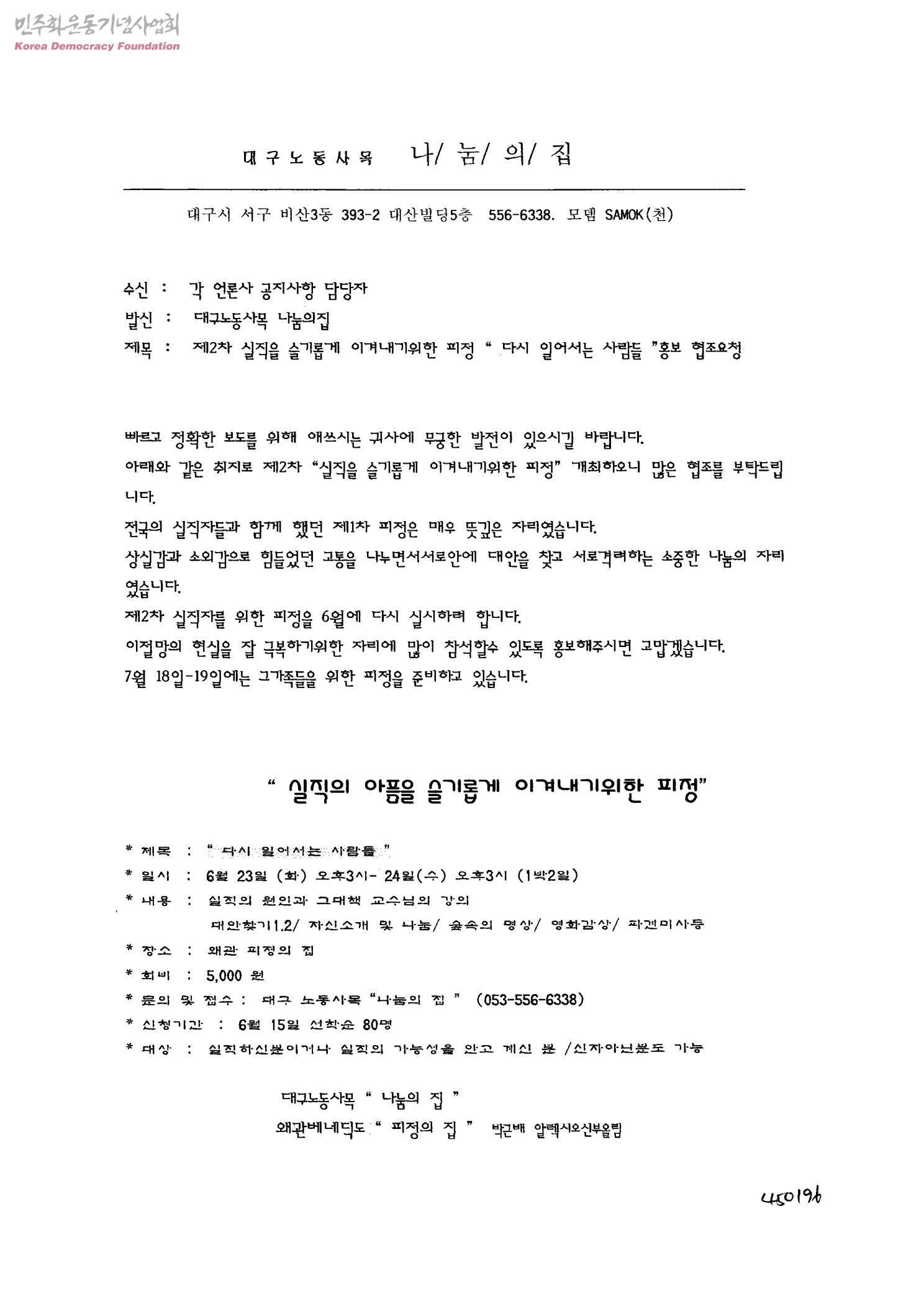 제2차 실직을 슬기롭게 이겨내기위한 피정 "다시 일어서는 사람들" 홍보 협조요청[수신:각 언론사 공지사항 담당자, 발신:대구노동사목 나눔의집]
