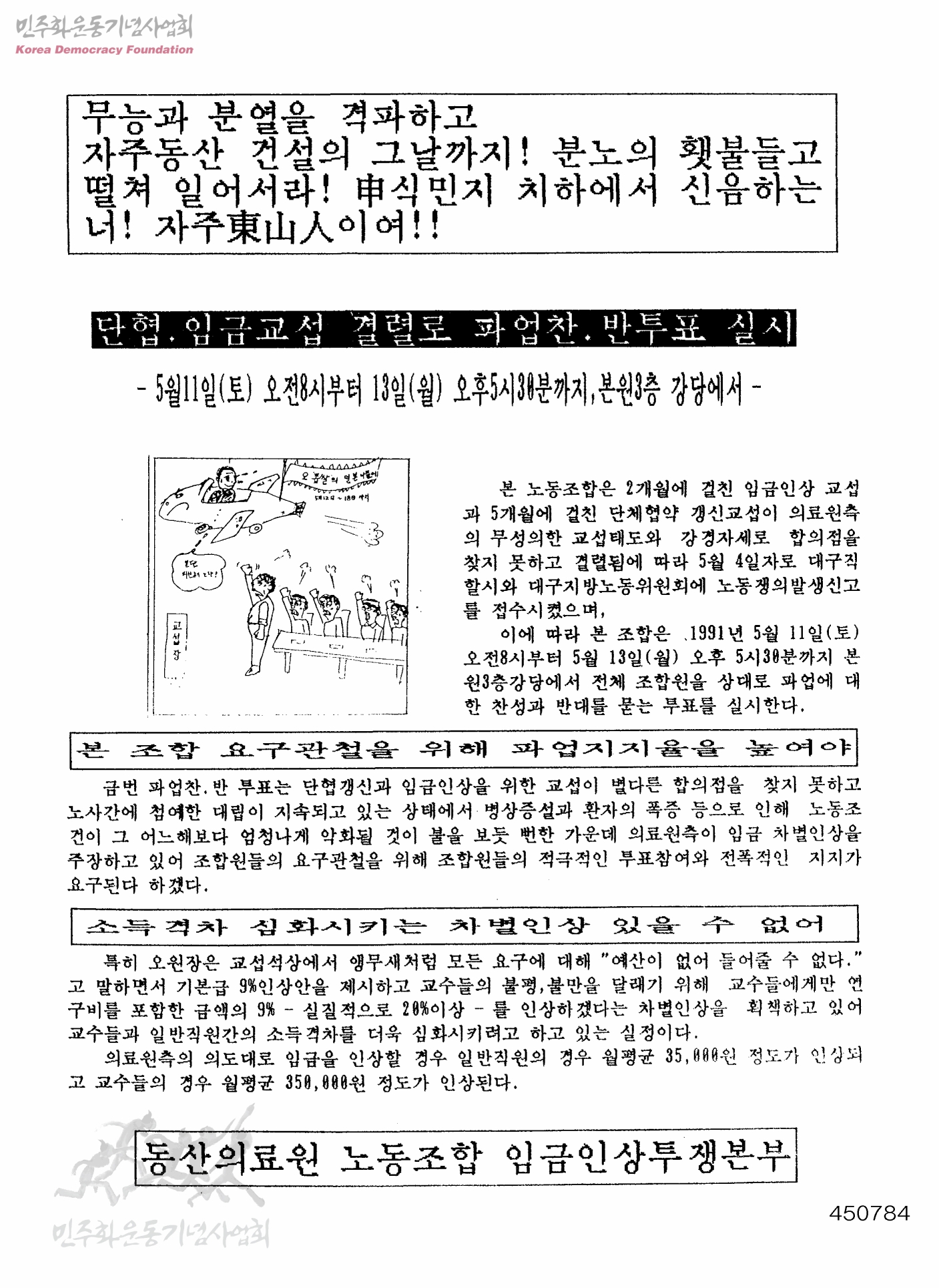 무능과 분열을 격파하고 자주동산 건설의 그날까지! 분노의 횃불들고 떨쳐 일어서라! 申식민지 치하에서 신음하는 너! 자주東山人이여!!
