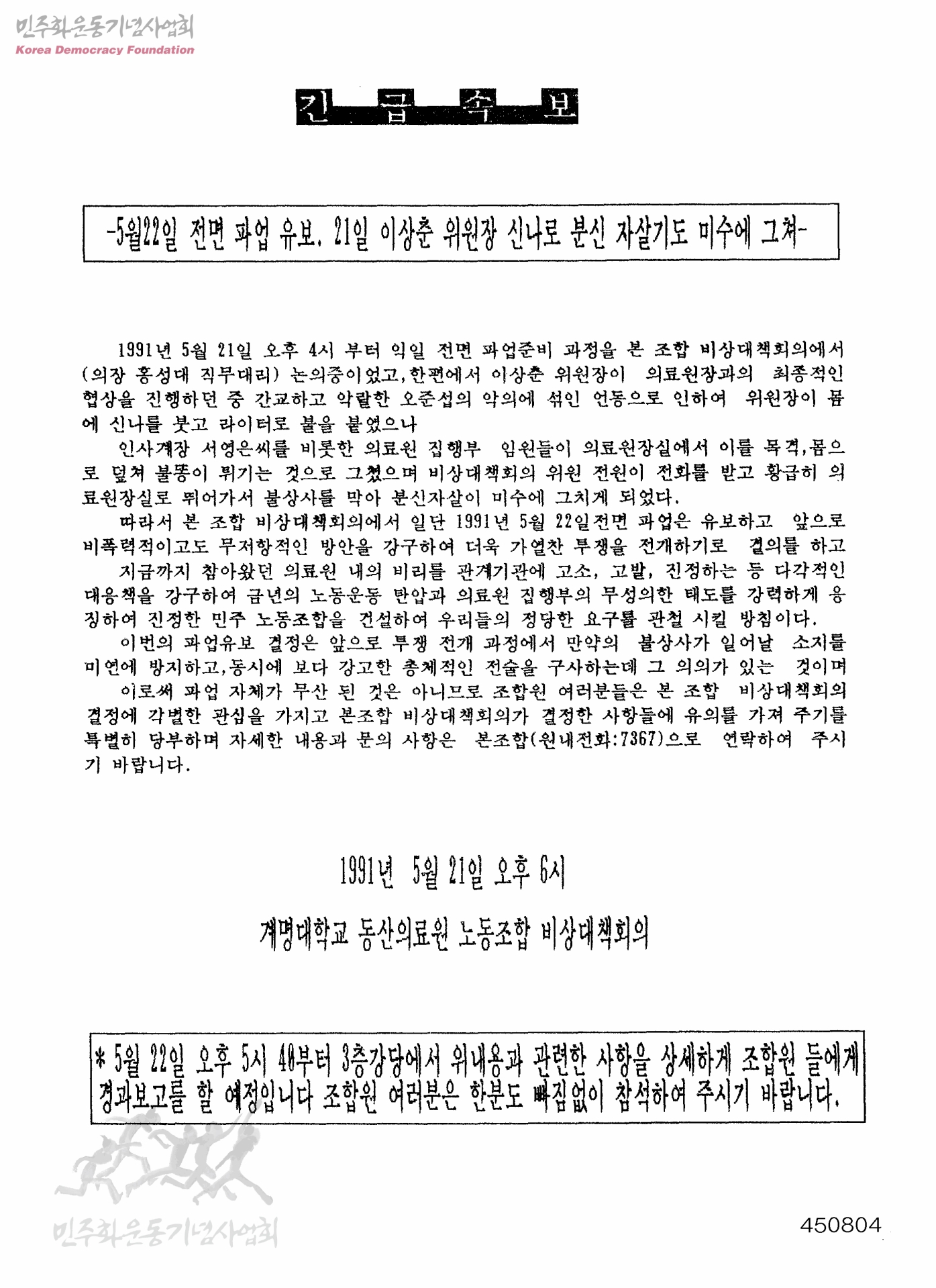긴급속보-5월22일 전면 파업 유보. 21일 이상춘 위원장 신나로 분신 자살기도 미수에 그쳐