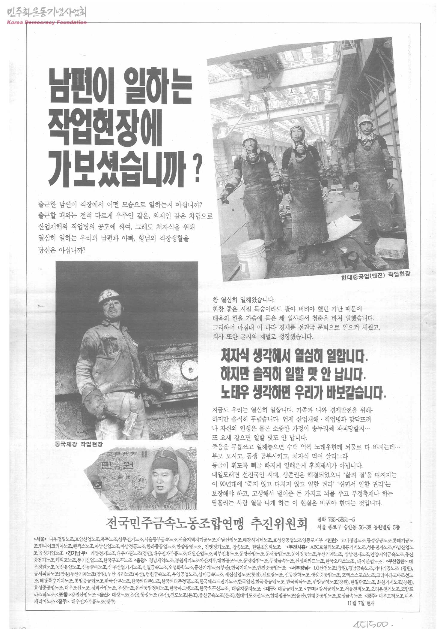 - 전국민주금속노동조합연맹추진위원회, 나우정밀노동조합, 보암산업노동조합, 북두노동조합, 삼주전기노동조합, 서울동부금속노동조합, 서울지역치기공노동조합, 아남산업노동조합, 태광하이텍노동조합, 효성중공업노동조합 영등포지부, 고니정밀노동조합, 동성상공노동조합, 롯데기공노동조합, 린나이코리아노동조합, 벤휙스노동조합, 아남산업노동조합, 아남정공노동조합, 한라중공업노동조합, 한양공영노동조합, 진영정기노동조합, 창송노동조합, 한일초음파노동조합, ABC보일러노동조합, 대층기계노동조합, 성음전자노동조합, 아남산업노동조합, 유성기업노동조합, 계양전기노동조합, 대우자판노동조합, 대우전자부품노동조합, 대원산업노동조합, 덕부진흥노동조합, 동광산업노동조합, 동서공업노동조합, 동아정공노동조합, 두산기계노동조합, 삼남전자노동조합, 안양지역금속노동조합, 유신중전기노동조합, 케피코노동조합, 풍기산업노동조합,한국후꼬꾸노동조합, 경남제약노동조합, 경원세기노동조합 아산지부, 대한공조노동조합, 동양강철노동조합, 두양금속노동조합, 신성패카드노동조합, 한국오티스노동조합, 배이산업노동조합, 대우정밀노동조합, 동신유압노동조합, 신동금속노동조합, 신우산업기기노동조합, 신일금속노동조합, 오성화학노동조합, 풍산기계노동조합, 한국기계노동조합, 한진중공업노동조합, LG산전노동조합, 경남금속노동조합, 기아기공노동조합, 동서식품노동조합