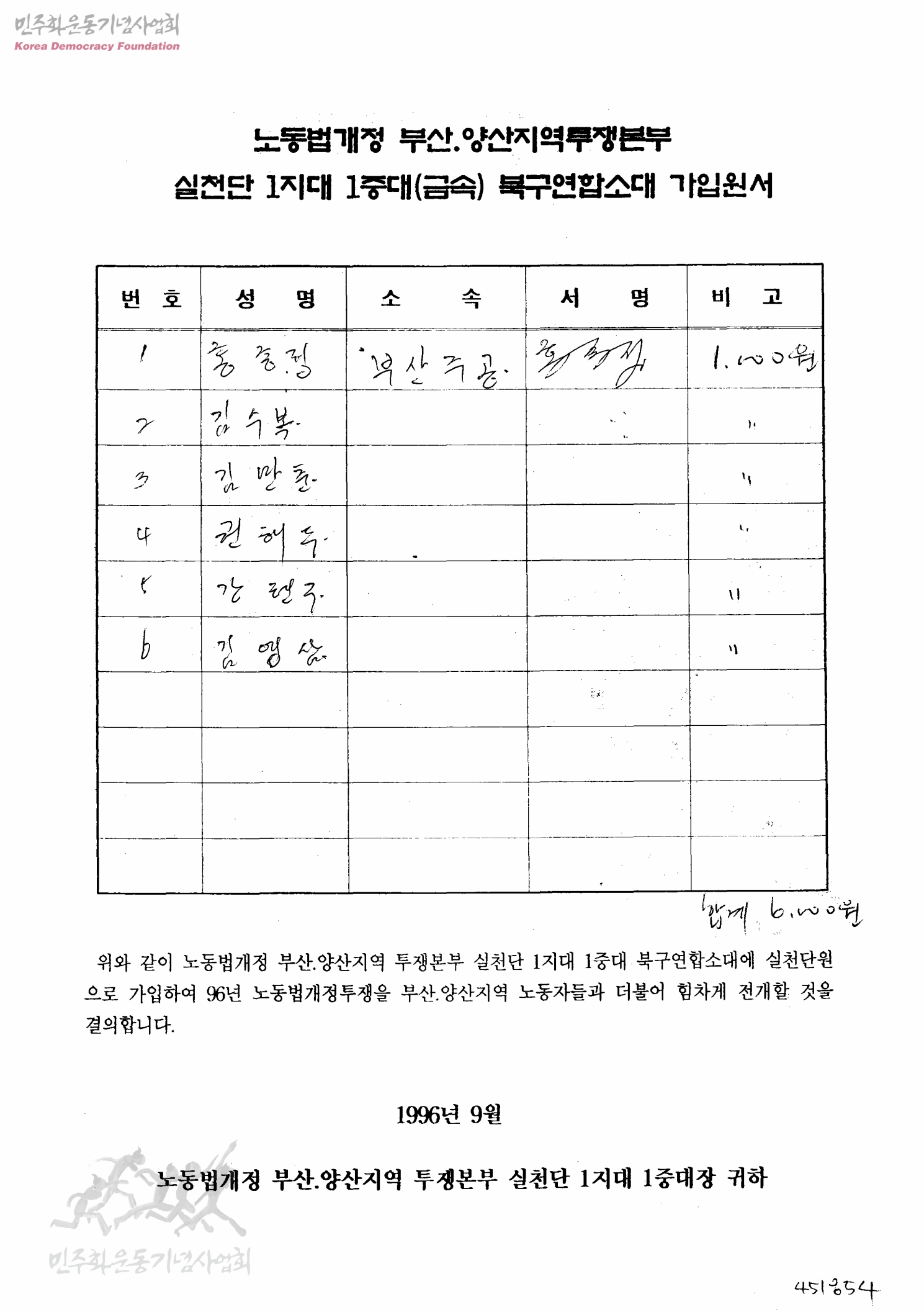 노동법개정부산.양산지역투쟁본부 실천단 1지대 1중대(금속) 북구연합소대 가입원서