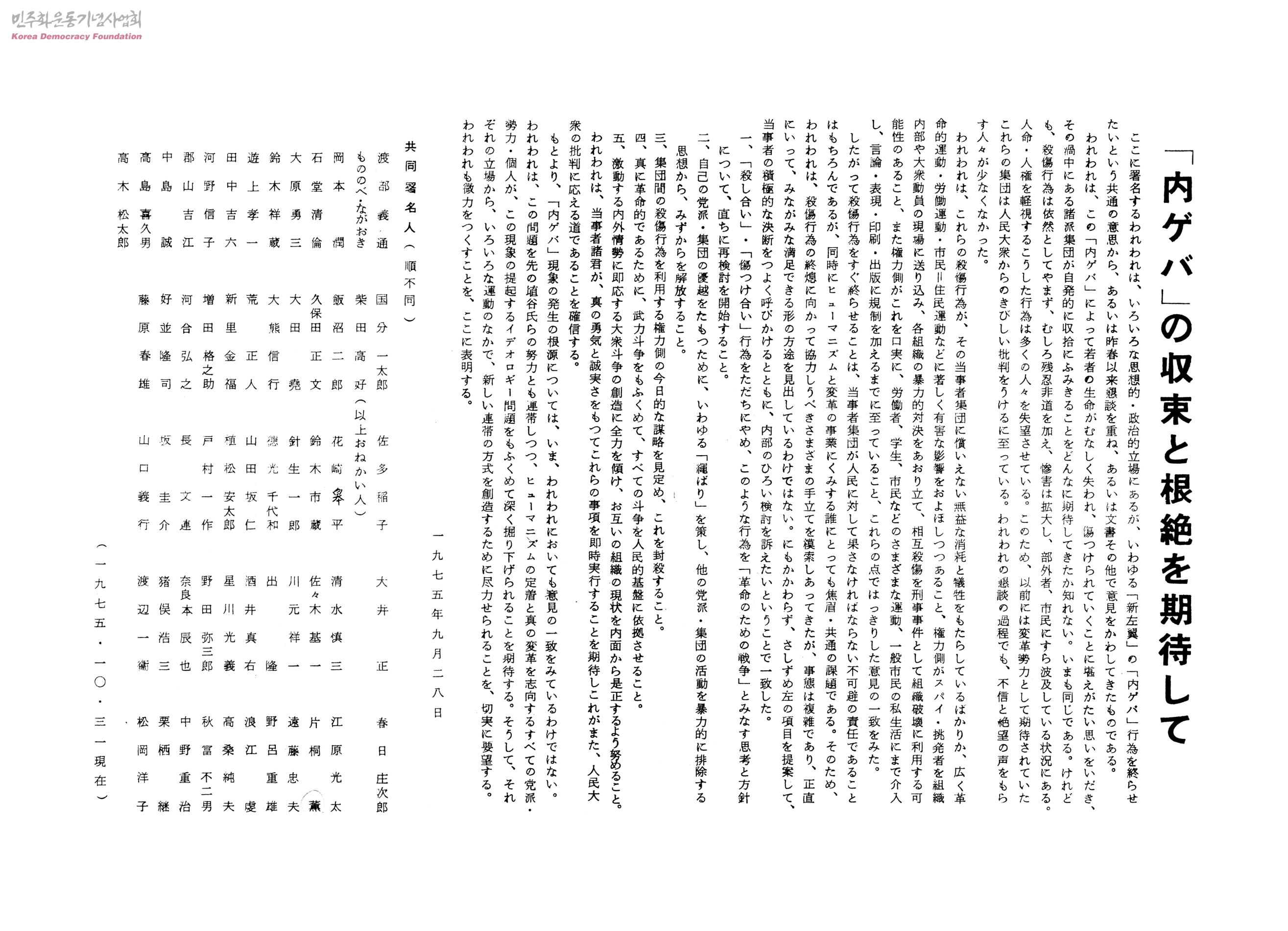- 渡部義通, もののべ ながおき, 岡本 潤, 石堂淸倫, 大原勇三, 鈴木祥藏, 遊上孝一, 田中吉六, 河野信子, 郡山吉江, 中島 誠, 高島 喜久男, 高木 松太郞, 國分 一太郞, 柴田高好, 飯沼二郞, 久保田 正文, 大田 堯, 大熊信行, 荒 正人, 新里金福, 增田 格之助, 河合弘之, 好並隆司, 藤原春雄, 佐多稻子(以上おねがい人), 花崎皋平 , 鈴木市藏, 針生一郞, 德光 千代和, 山田坂仁, 植松 安太郞, 戶村一作, 長 文連, 坂 圭介, 山口義行, 大井 正, 淸水愼三, 佐佐木 基一, 川元祥一, 出 隆, 酒井直右, 星川光義, 野田 弥三郞, 奈良本 辰也, 猪俣浩三, 渡邊一衛, 春日 庄次郞, 江原光太, 片桐 薰, 遠藤忠夫, 野呂重雄, 浪江 虔, 高桑純夫, 秋夫 不二男, 中野重治, 栗栖 繼, 松岡洋子