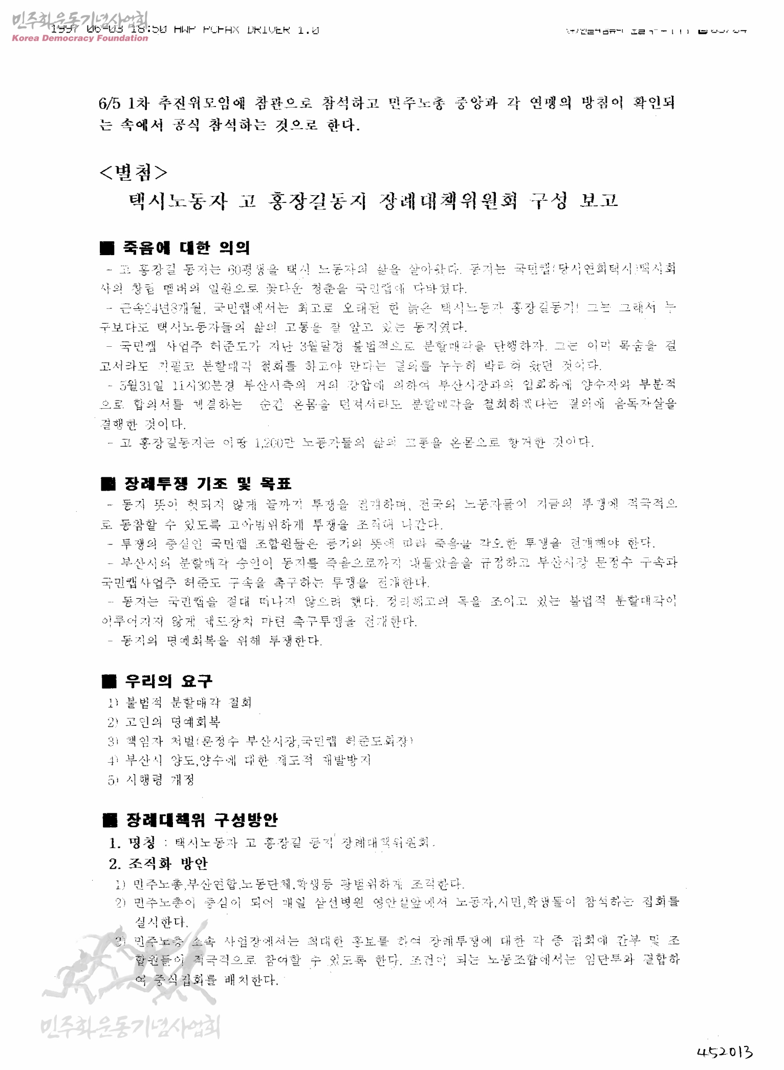 택시노동자 고 홍장길동지 장례대책위원회 구성 보고