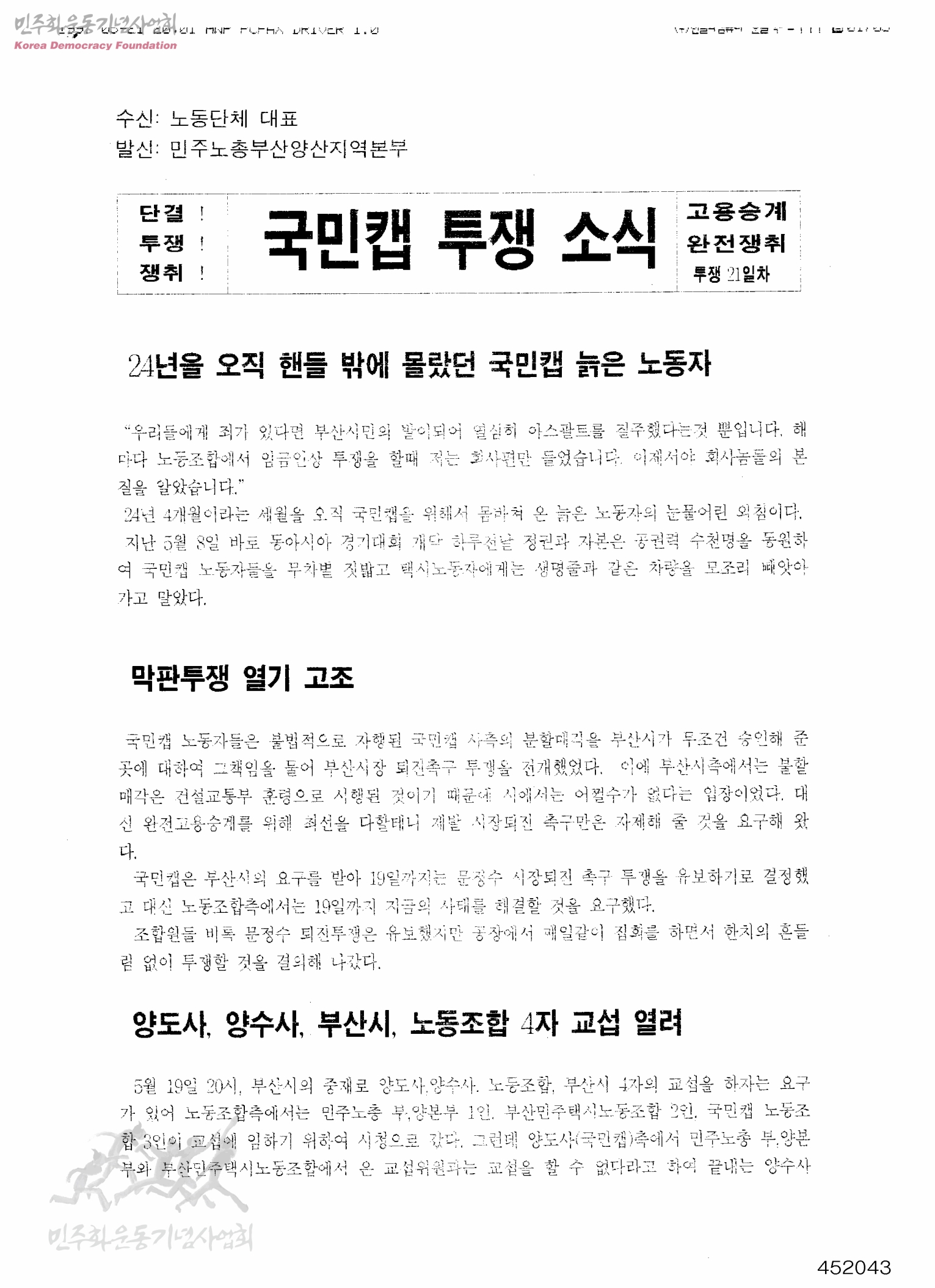 국민캡 투쟁소식[수신:노동단체 대표,발신:민주노총부산양산지역본부]