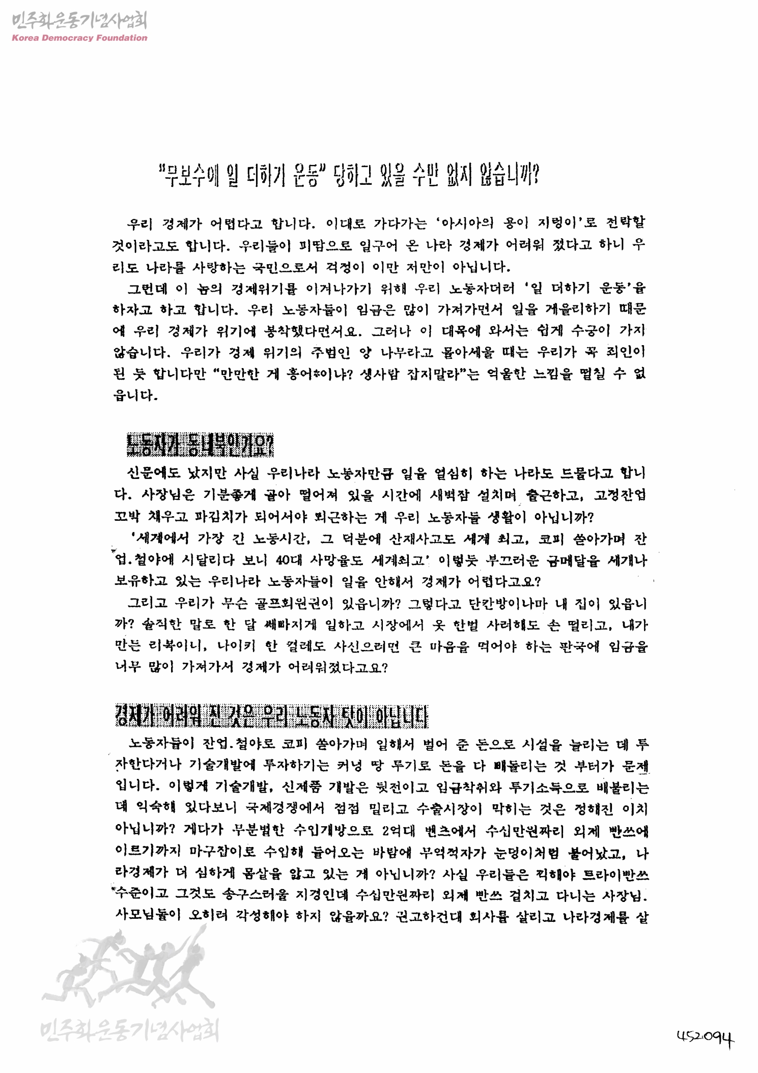 "무보수에 일 더하기 운동" 당하고 있을 수만 없지 않습니까?