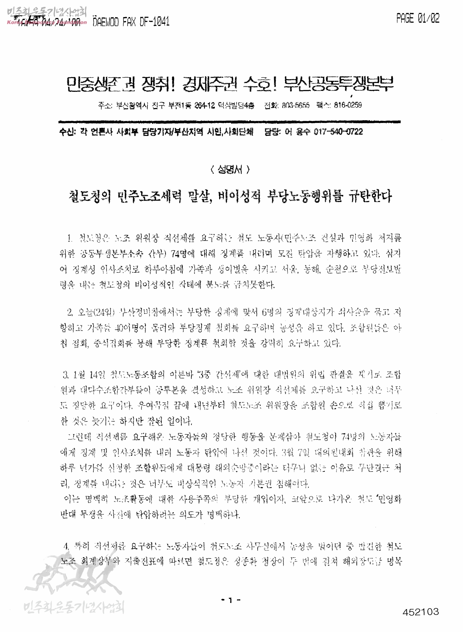 성명서-철도청의 민주노조세력 말살, 비이성적 부당노동행위를 규탄한다[수신:각 언론사 사회부 담당기자/부산지역 시민,사회단체]