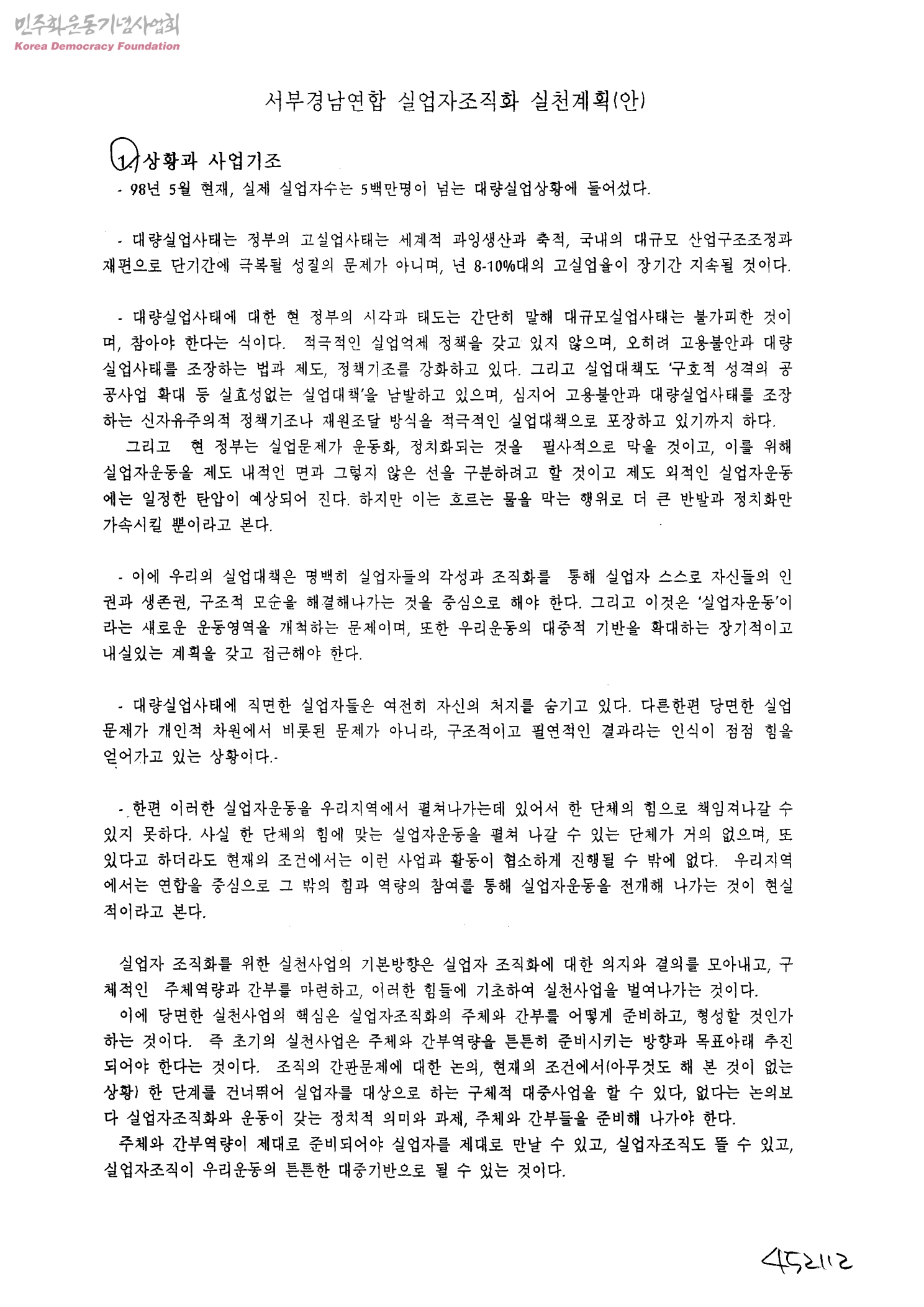 서부경남연합 실업자조직화 실천계획(안)