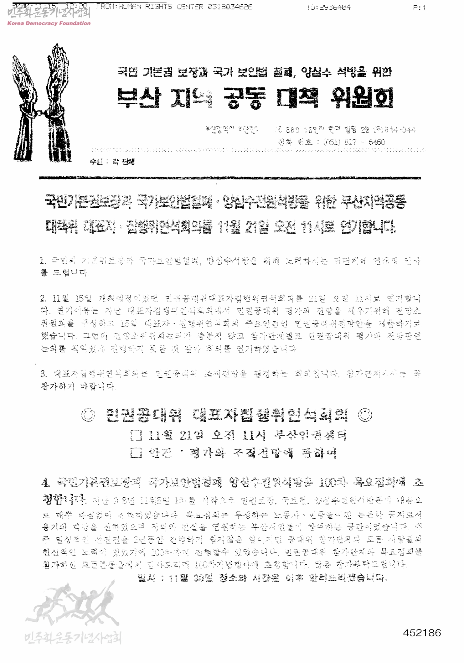 [국민기본권보장과국가보안법철폐,양심수석방을위한부산지역공동대책위원회 회의 연기관련하여 각 단체에 보내는 수발신문서]
